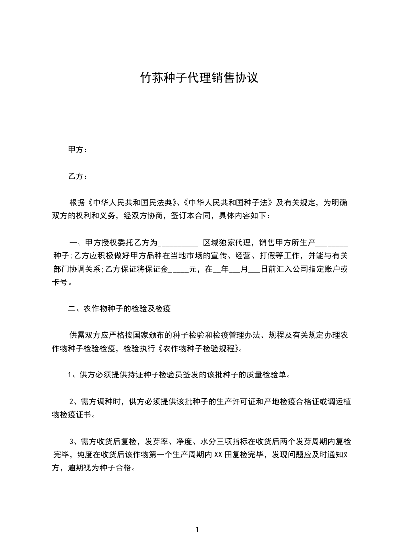 一、甲方授权委托乙方为__________ 区域独家代理,销售甲方所生产________ 种子;乙方应积极做好甲方品种在当地市场的宣传、经营、打假等工作,并能与有关部门协调关系;乙方保证将保证金_____元,在__年___月___日前汇入公司指定账户或卡号。