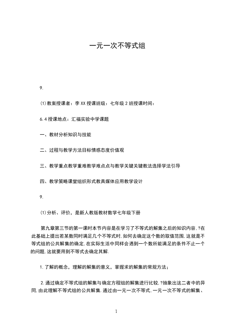 三、教学任务分析“一元一次不等式组”是从已有的知识构建回顾出发,遵循从具体的实际问题中抽象出不等式组的概念的过程,我们知道求未知数取值范围的问题是普遍存在的,在涉及两个以上数量间的大小关系时,不等式组是解决这些问题的有力工具,因此必须学会求解一元一次不等式组的解集,可见本课时在这一章以及以后的数学学习中具有举足轻重的作用。本节课教学主要以鼓励学生利用类比思想和数形结合思想自主探究,合作交流,大胆表述,满足学生多样化的学习要求。此外,二元一次方程组与一元一次不等式组,两者既有联系又有差异,因此,在教学中一要注重类比,做好从方程组到不等式组的迁移;二要重视化归、数形结合等数学思想方法的渗透。