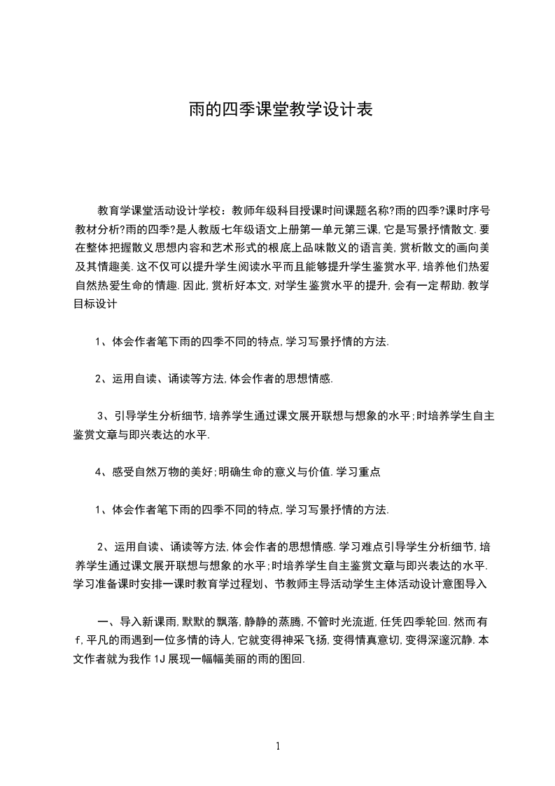 教育学课堂活动设计学校:教师年级科目授课时间课题名称?雨的四季?课时序号教材分析?雨的四季?是人教版七年级语文上册第一单元第三课,它是写景抒情散文.要在整体把握散义思想内容和艺术形式的根底上品味散义的语言美,赏析散文的画向美及其情趣美.这不仅可以提升学生阅读水平而且能够提升学生鉴赏水平,培养他们热爱自然热爱生命的情趣.因此,赏析好本文,对学生鉴赏水平的提升,会有一定帮助.教学目标设计