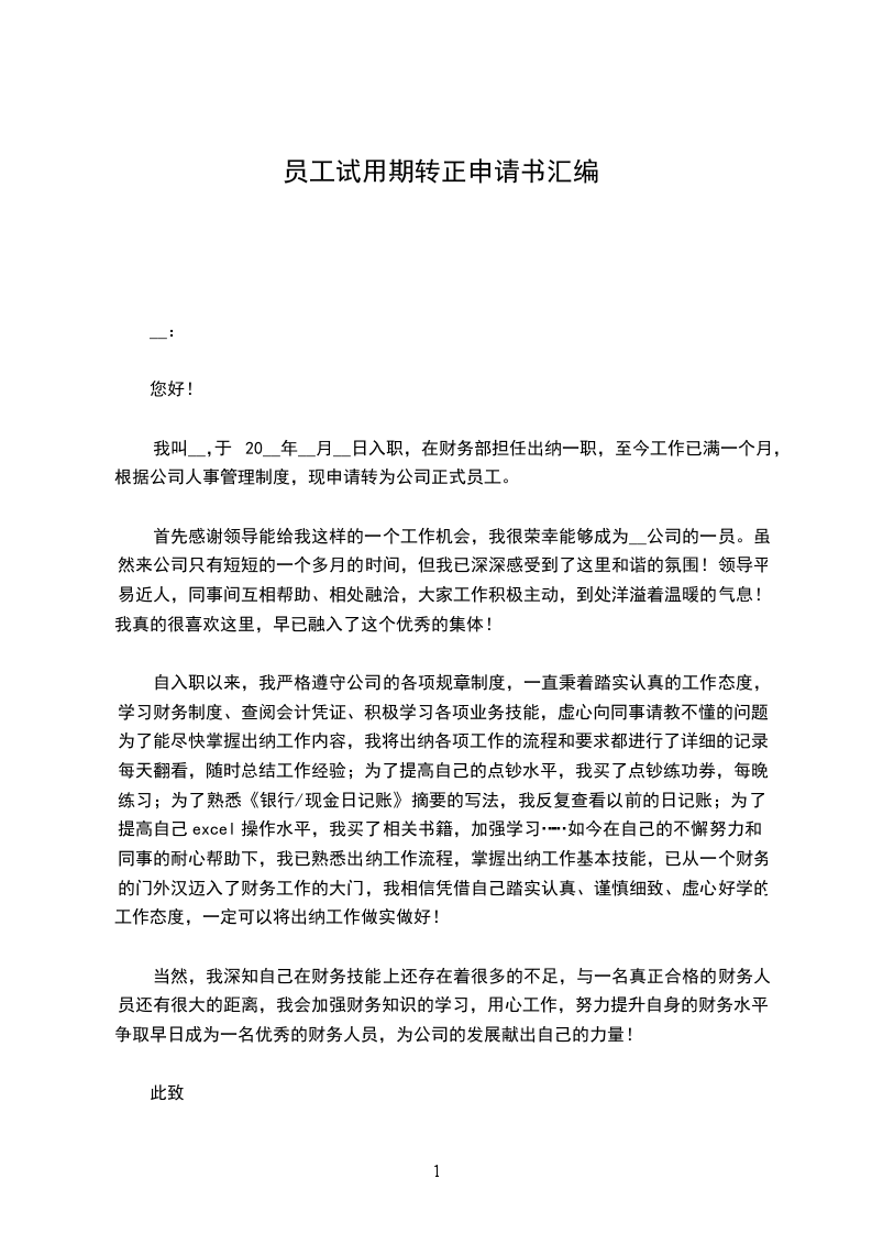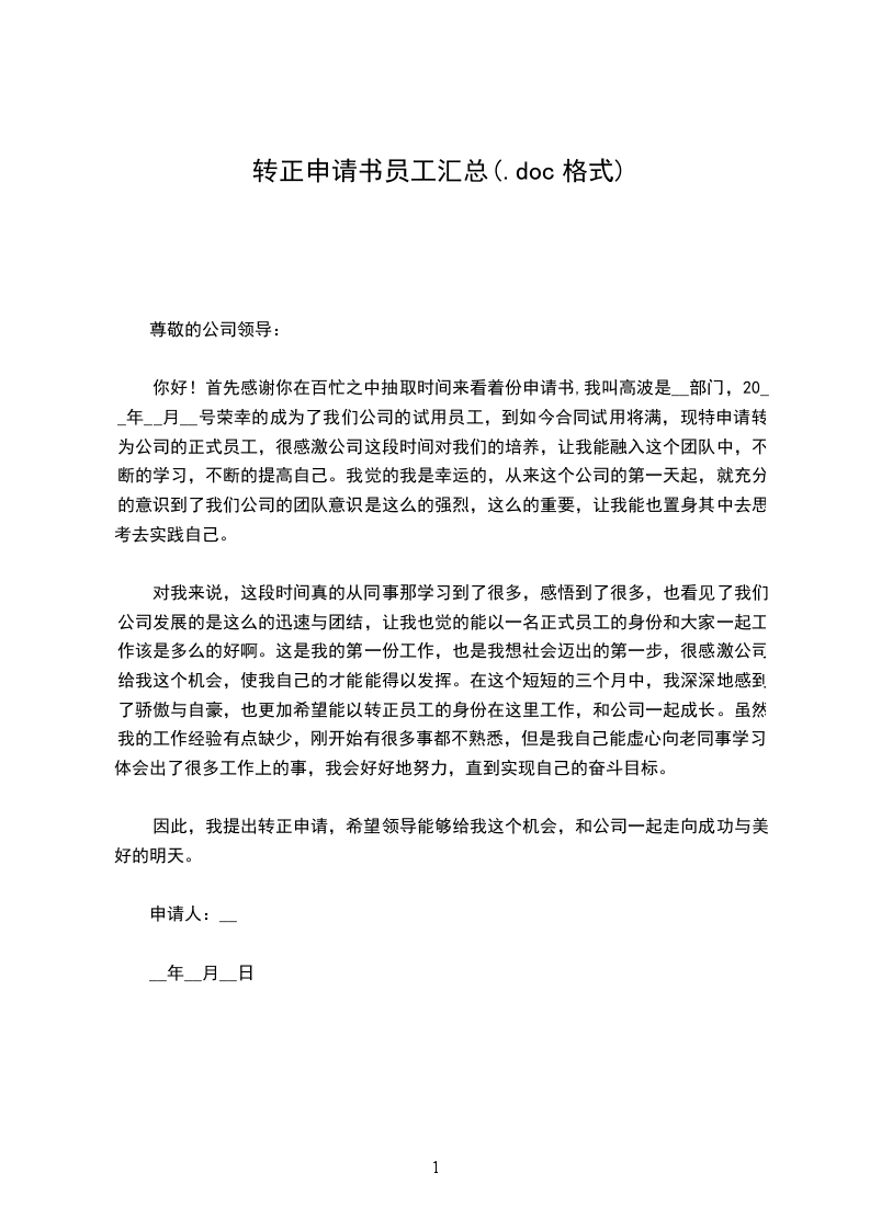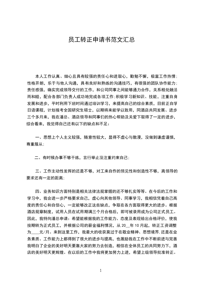 四、业务知识方面特别是相关法律法规掌握的还不够扎实等等。在今后的工作和学习中,我会进一步严格要求自己,虚心向其他领导、同事学习,我相信凭着自己高度的责任心和自信心,一定能够改正这些缺点,争取在各方面取得更大的进步。根据酒店规章制度,试用人员在试用期满三个月合格后,即可被录用成为公司正式员工。因此,我特向潘总申请:希望能根据我的工作能力、态度及表现给出合格评价,使我按期转为正式员工,并根据公司的薪金福利情况,从20__年10月起,转正工资调整为____元/月。来到这里工作,我最大的收获莫过于在敬业精神、思想境界,还是在业务素质、工作能力上都得到了很大的进步与提高,也激励我在工作中不断前进与完善。我明白了企业的美好明天要靠大家的努力去创造,相信在全体员工的共同努力下,酒店的美好明天更辉煌。在以后的工作中我将更加努力上进,希望上级领导批准转正。此致敬礼员工转正申请书篇2尊敬的领导:您好!我叫___。首先,非常感谢您给我到贵公司学习的机会。对此,我倍感荣幸。我20__年3月21日成为公司的一名员工,担任物业部样板间接待一职,截止到20__年5月20日已工作两个月。根据公司的规章制度,现申请转为公司正式员工。两个月以来,非常感谢领导对我的关心与指导,以及同事们对我无私的帮助,让我深深的感受到公司优秀的企业文化,更让我对自己本职工作的内容从了解到掌握。物业公司重在服务,而服务的关键在于细节,在面对客户与业主时,不但要有耐心和细心,而且还要有较强的责任心。并能在工作中锐意进取、不断超越,努力提高自己的专业素质的同时,力争使工作质量登上一个崭新的台阶,为公司美好明天贡献自己的力量与激情。第一、军训初到公司工作的第一天就是军训,刚开始一听,感觉挺有意思的,大学时的军训,只是走一个流程而已,想着不会很严,真正经历了才知道没那么简单。马教官为了让我们站好军姿,就把扑克牌夹在我们手里,容不得我们有半点的松懈,想偷懒就更不用说啦!在训练时每当我感觉到累、想到要偷懒时,就会想起“人无压力轻飘飘,茎无压力不出油”之类的励志名言,来激励自己,为自己加油打气。军训使学会了给自己加压、释压,在压力下成长、进步。每天的基础动作训练,看似简单但要做到标准,规范还须要我们反复的去练习、去训练。军训不但能培养人吃苦耐劳的精神,而且能磨练人坚强的意志。培养良好的个人形象和姿态。为今后的工作中能严格要求自己,实现自己的人生价值,做好了铺垫!第二、培训军训的同时,杨X开始了服务标准礼仪的课程,作为服务行业,细节化服务礼仪很重要,通过学习使我在自身能力和素质方面有了很大的提升,在培训课程中不时地穿插各种团队建设的小游戏,用传名片游戏让我们从中感悟出团队协作的重要性,让我们深刻地感到一个团队要齐心协力,互相配合。在“人生应该养成的十大好习惯”的培训中,使我们能够正确认识到“一个好习惯可以让自己享受一辈子”之类的人生哲理,感悟出好的习惯养成贵在坚持。培训时杨X亲自授课、他言语幽默、讲解细致,让我们带着快乐的心情学习,通过培训使我学到了很多在社交过程中的沟通技巧和实用礼仪。在以后工作生活之余我会坚持不断的练习,将学到知识灵活应运到工作中,立足泽龙细节服务标准定位。