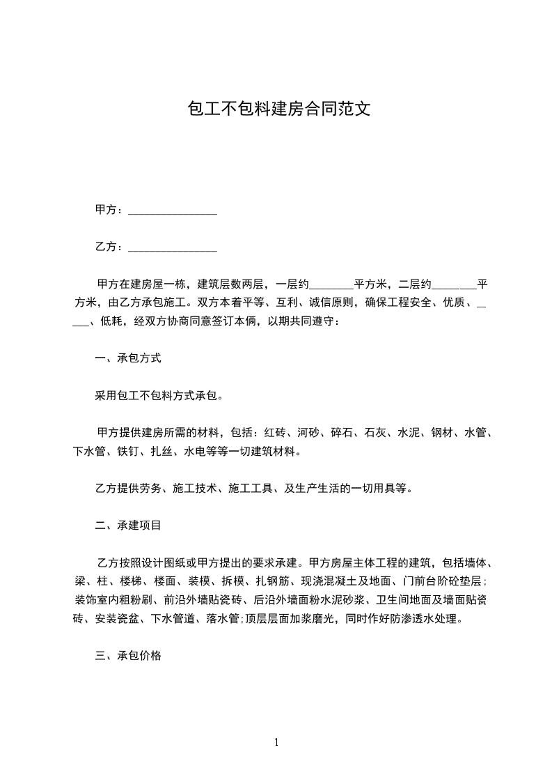 甲方在建房屋一栋,建筑层数两层,一层约________平方米,二层约________平方米,由乙方承包施工。双方本着平等、互利、诚信原则,确保工程安全、优质、_____、低耗,经双方协商同意签订本俩,以期共同遵守: