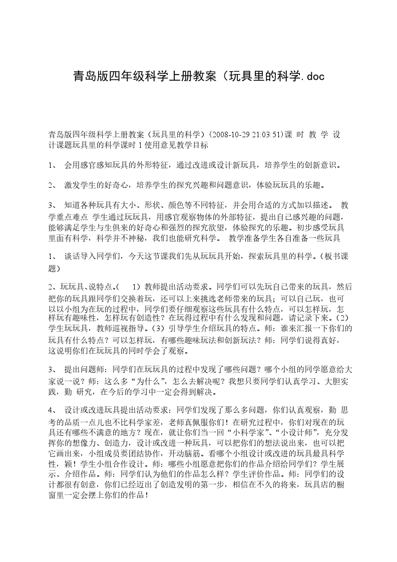 4发展目标:培养学生想像力和创造力及解决问题的能力。会滚的玩具教学重点:合理选用废旧材料,表现滚动玩具细节部分。教学难点:培养学生自选材料、自筹材料、自制玩具的能力以及如何设计造型的方式。教学准备:(学生)易拉罐、纸碟、吸管、厚质纸、剪刀、双面胶、彩笔等;(教师)各种类型玩具、课件、范作。教学过程: