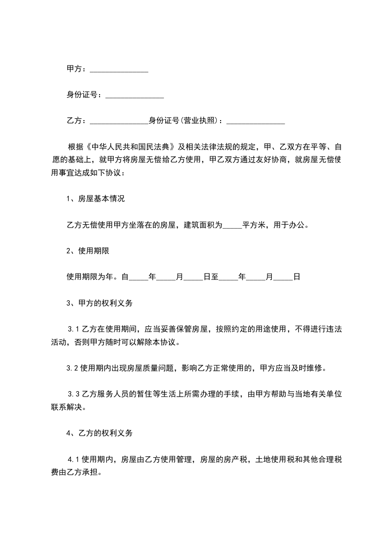 乙方无偿使用甲方坐落在的房屋,建筑面积为_____平方米,用于办公。