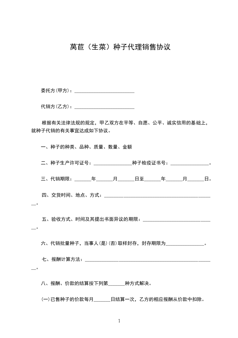 根据有关法律法规的规定,甲乙双方在平等、自愿、公平、诚实信用的基础上,就种子代销的有关事宜达成如下协议。