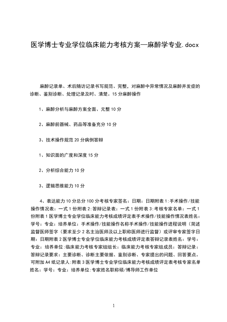 4、表达能力10分总分100分考核专家签名:日期:日期附表1:手术操作/技能操作情况表:一式1份附表2:答辩记录表:一式1份附表3:考核专家名单:一式1份附表1医学博士专业学位临床能力考核成绩评定表手术操作/技能操作情况表姓名:学号:专业:培养单位:手术操作/技能操作名称手术操作/技能操作进程说明(简述)监督医师签字(要求至少2名主治医师及以上职称医师进行监督)或评审专家签字日期:日期附表2医学博士专业学位临床能力考核成绩评定表答辩记录表姓名:学号:专业:培养单位:临床能力考核专家组组长:临床能力考核专家组成员:答辩记录:答辩记录要求:主要诊断、诊断主要依据、鉴别诊断、专家提出的问题、回答要点。可附加A4纸记录人:附表3医学博士专业学位临床能力考核成绩评定表考核专家名单姓名:学号:专业:培养单位:专家姓名职称硕/博导师工作单位