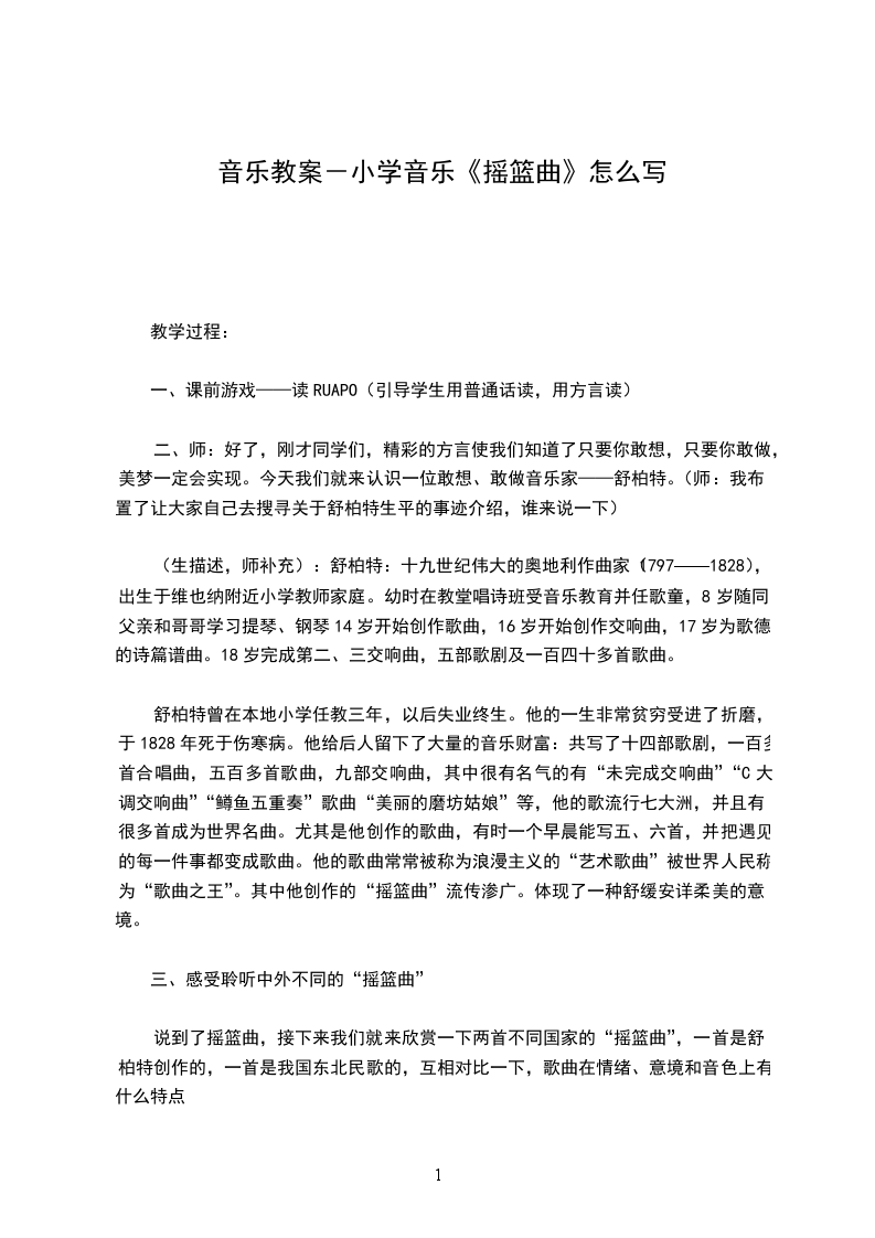 一、认知性:了解摇篮曲的音乐体裁特征和音乐家舒伯特。