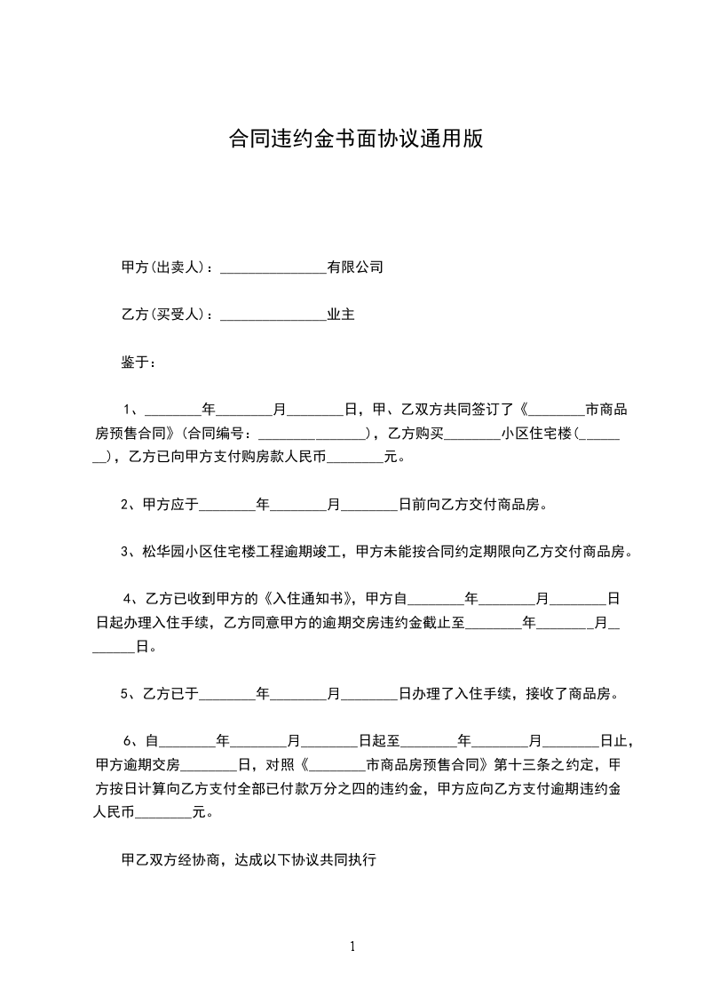合同违约金书面协议通用版