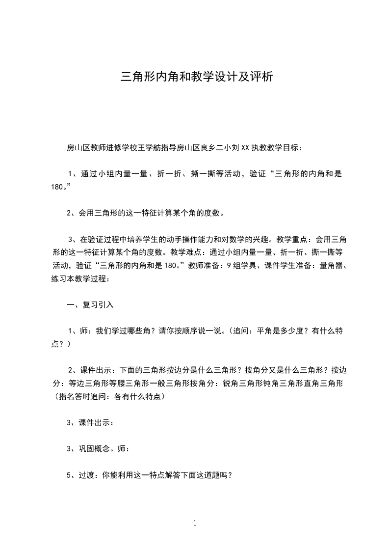 3、在验证过程中培养学生的动手操作能力和对数学的兴趣。教学重点:会用三角形的这一特征计算某个角的度数。教学难点:通过小组内量一量、折一折、撕一撕等活动,验证“三角形的内角和是180。”教师准备:9组学具、课件学生准备:量角器、练习本教学过程: