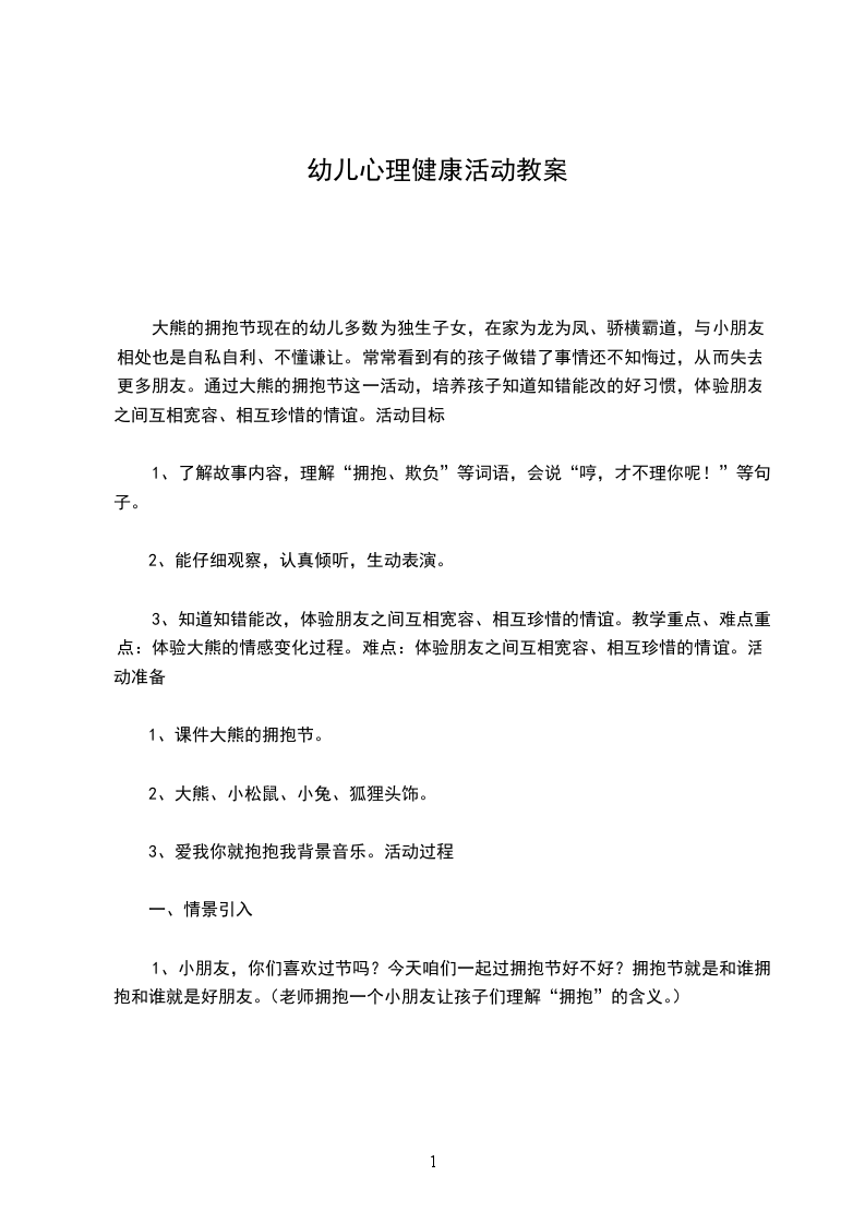 大熊的拥抱节现在的幼儿多数为独生子女,在家为龙为凤、骄横霸道,与小朋友相处也是自私自利、不懂谦让。常常看到有的孩子做错了事情还不知悔过,从而失去更多朋友。通过大熊的拥抱节这一活动,培养孩子知道知错能改的好习惯,体验朋友之间互相宽容、相互珍惜的情谊。活动目标