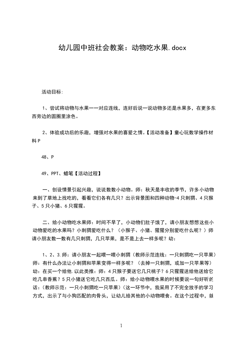 二、给小动物吃水果师:时间不早了,小动物们肚子饿了,请小朋友想想这些小动物爱吃的水果吗?小刺猬爱吃什么?(小猴子、小猪、猩猩分别爱吃什么呢?)师:请小朋友数一数有几只刺猬,几只苹果,是不是上去一样多呢?幼: