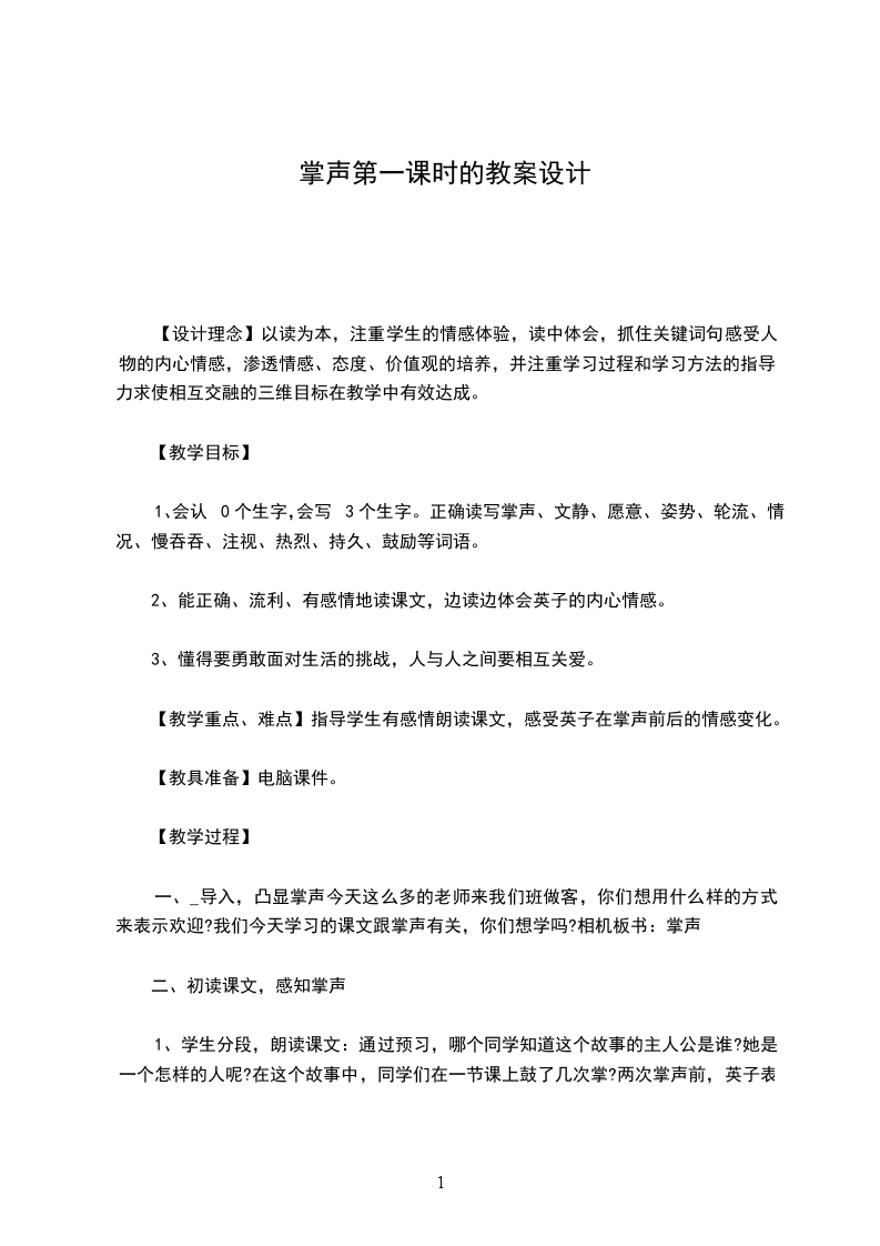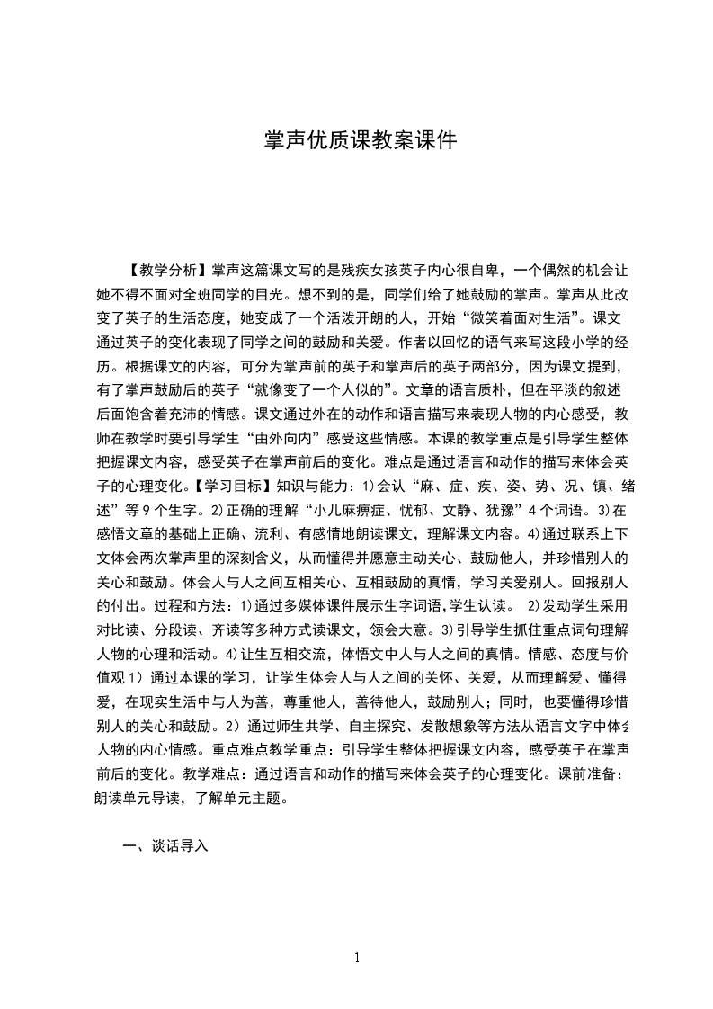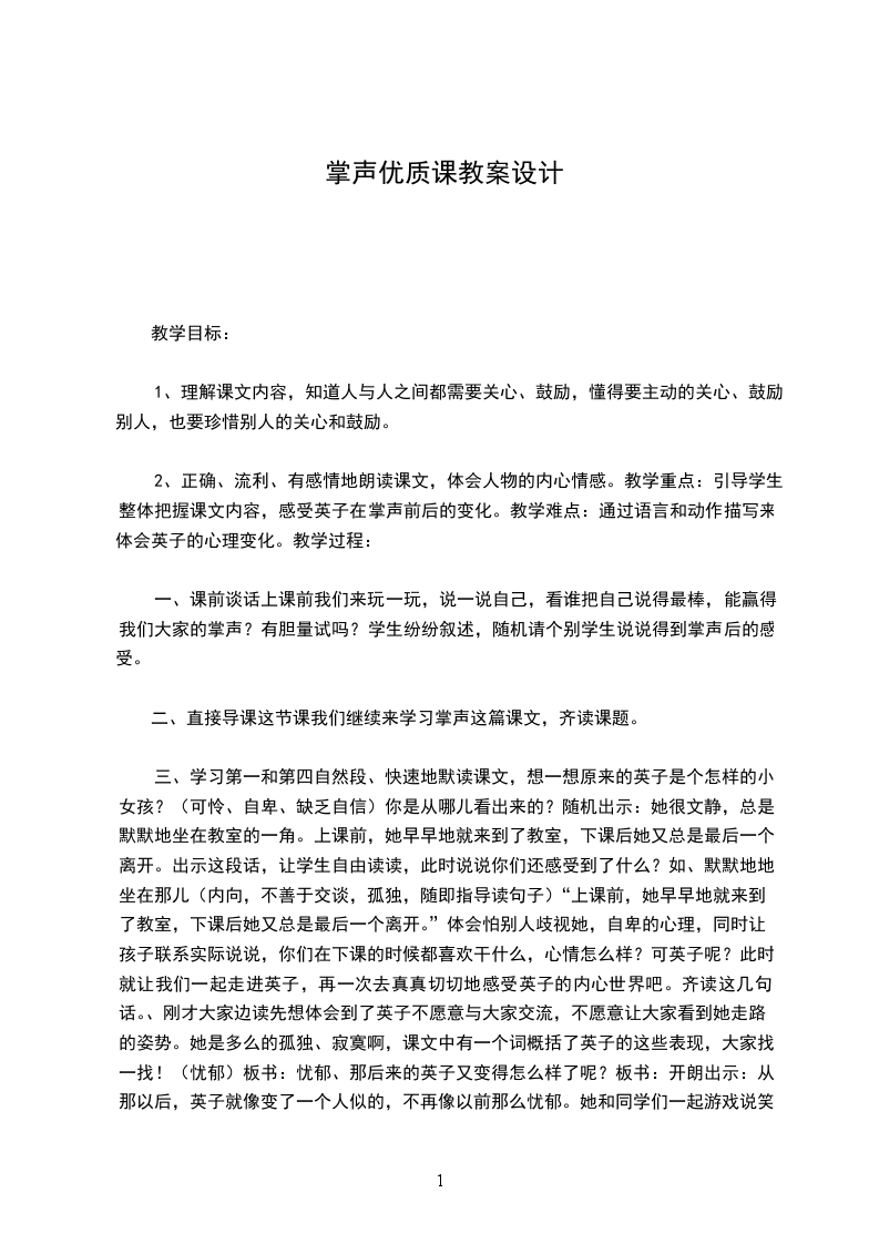 4、师:孩子们,故事会结束了,掌声也成了永久的记忆,但英子的故事并没有结束。几年后,我收到了英子的来信。配乐(夜的钢琴曲5)师范读。“我永远不会忘记那掌声,因为它使我明白,同学们并没有歧视我。大家的掌声给了我极大的鼓励,使我鼓起勇气微笑着面对生活。”师:微笑着面对生活,说的多好啊!师:充满鼓励与赞美的掌声让英子不再担心,不在害怕,难怪英子说:生:师:正是同学们,那饱含关爱与尊重的掌声,让英子重拾信心,难怪英子说:生:师:让我们一起大声说出英子心底的呼声!生:师小结:试想没有那2次掌声,英子会有之后的变化么?(不会)这次掌声不仅仅代表的是鼓励,是赞美,其实掌声更加饱含了,同学们对英子的(爱啊!)板书画心!