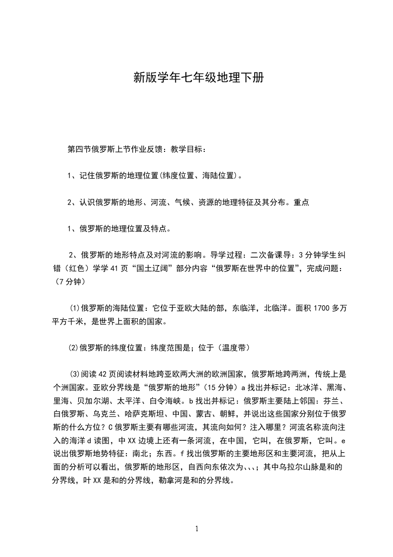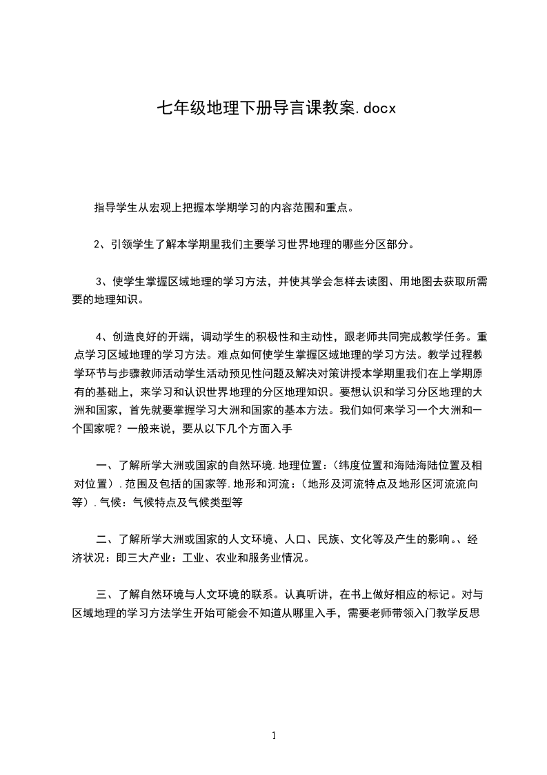 二、教学目标完成七年级下册地理教学任务。通过教学,使学生掌握必要的地理知识,和基本的绘图技能。对我们所生活的世界有更清晰明了的了解,对世界上一些重要的国家和地区有较为详尽的了解。同时通过地理教学,提高学生的观察、探究能力,发展学生的创新思维,培养学生互助合作的精神。