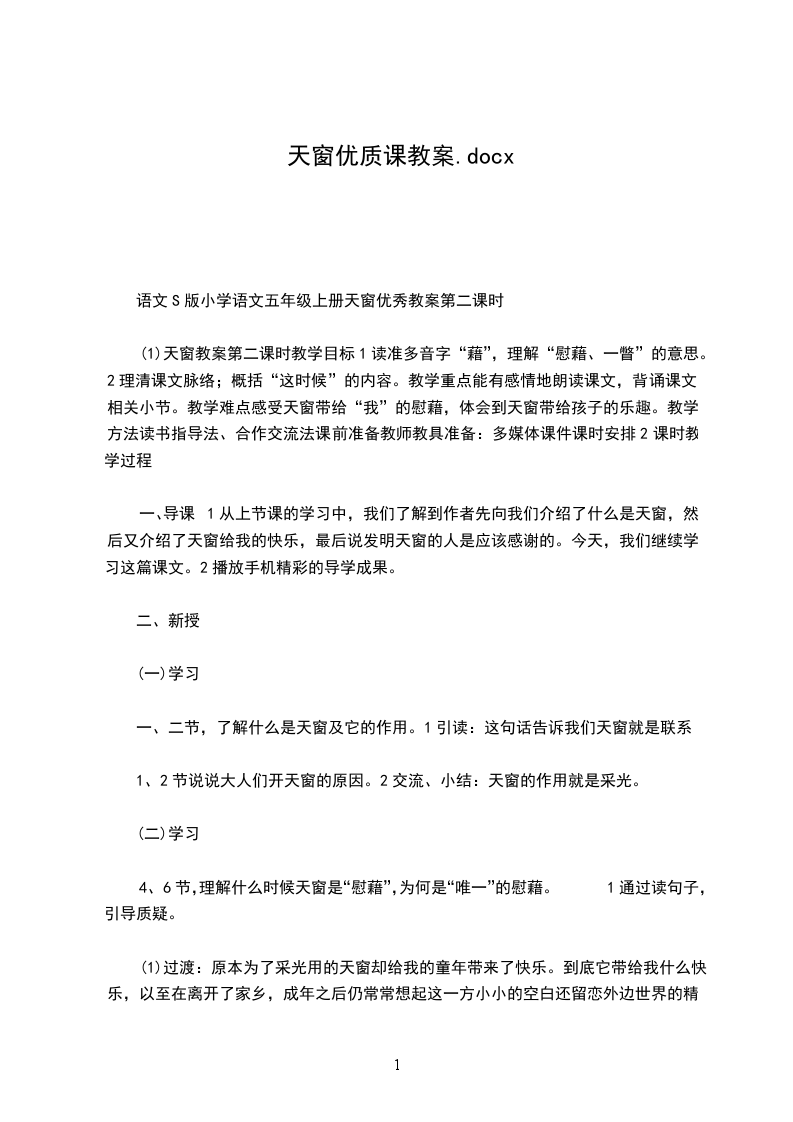 (2)摘抄文中描写屋子、闪电、云彩、星、蝙蝠、夜莺、猫头鹰的语句设计意图:课堂小结,巩固积累。【板书设计】3天窗什么是天窗天窗的魅力一唯一的慰藉、3天窗【教学目标】知识与技能:1.会认“慰、藉”等2个生字,读准1个多音字“卜”,会写“锐、滩、鹰”等11个生字,会写“慰藉、扫荡、威力”等词语。2.有感情地朗读课文。过程与方法:1.通过有感情地朗读,体会“慰藉”“扫荡”“神奇”等词语的意思。2.读第48自然段,体会天窗的神奇以及给孩子们带来的唯一慰藉;领会从“无”中看出“有”,从“虚”中看出“实”的真谛;理解作者对天窗的特殊感情,让学生感受到通过“天窗”看世界的情趣。3.学习课文中比喻、排比的修辞手法,培养学生丰富的想象和联想。情感态度与价值观:激发孩子们对外面的世界的向往与追求,培养其丰富的想象力和创造力。【教学重点】理解课文内容,体会小小的天窗是孩子们唯一的慰藉,并唤起学生的共鸣。教教学难点】体会句子“因为活泼会想的孩子们知道怎样从无中看出有,从虚中看出实,比任何他看到的都更真切,更阔达,更复杂,更确实”的深刻含义感悟作者写作上的独具匠心。【教学准备】多媒体课件【课时安排】2课时第二课时【课时目标】1.读第48自然段,体会天窗的神奇以及给孩子们带来的唯一慰藉;领会从“无”中看出“有”,从“虚”中看出“实”的真谛;理解作者对天窗的特殊感情,让学生感受到通过“天窗”看世界的情趣。2.学习课文中比喻、排比的修辞手法,培养学生丰富的想象和联想。【教学过程】
