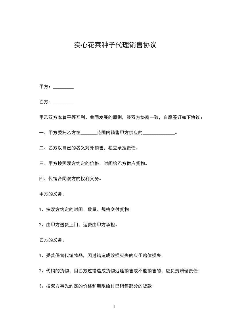 实心花菜种子代理销售协议