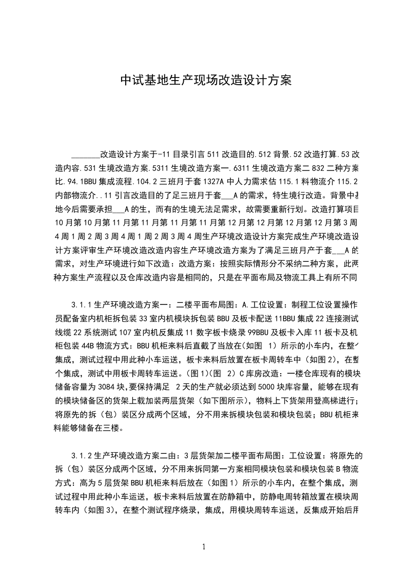 _______改造设计方案于-11目录引言511改造目的.512背景.52改造打算.53改造内容.531生境改造方案.5311生境改造方案一.6311生境改造方案二832二种方案比.94.1BBU集成流程.104.2三班月于套1327A中人力需求估115.1料物流介115.2内部物流介..11引言改造目的了足三班月于套___A的需求,特生境行改造。背景中基地今后需要承担___A的生,而有的生境无法足需求,故需要重新行划。改造打算项目10月第10月第11月第11月第11月第11月第12月第12月第12月第12月第3周4周1周2周3周4周1周2周3周4周生产环境改造设计方案完成生产环境改造设计方案评审生产环境改造改造内容生产环境改造方案为了满足三班月产于套___A的需求,对生产环境进行如下改造:改造方案:按照实际情形分不采纳二种方案,此两种方案生产流程以及仓库改造内容是相同的,只是在平面布局及物流工具上有所不同。