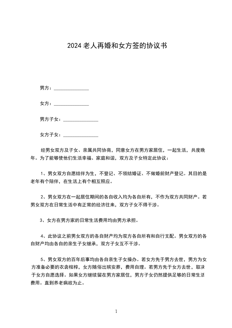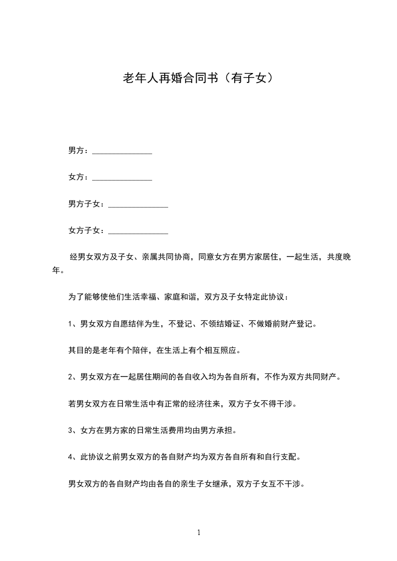 男、女双方均系独身,现年龄较大。为了生活上能有所照料,情感上有所依托,双方自愿结婚。同时为了能够生活美满,家庭和谐,双方及子女特定此协议。
