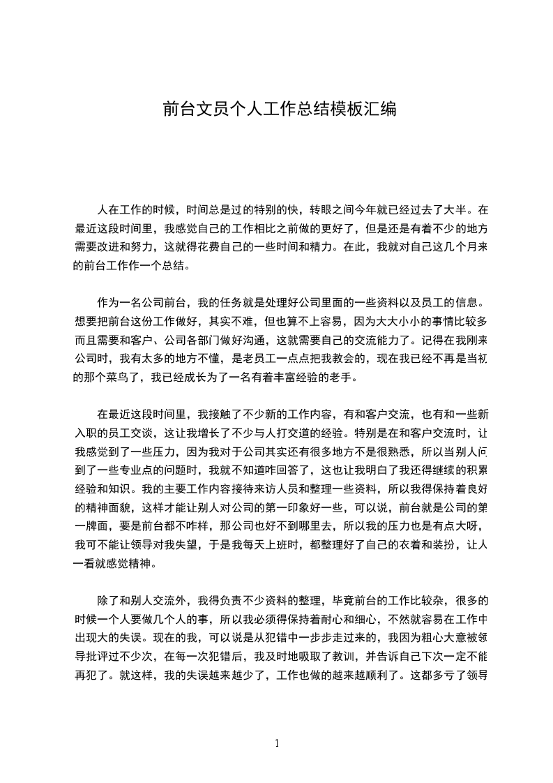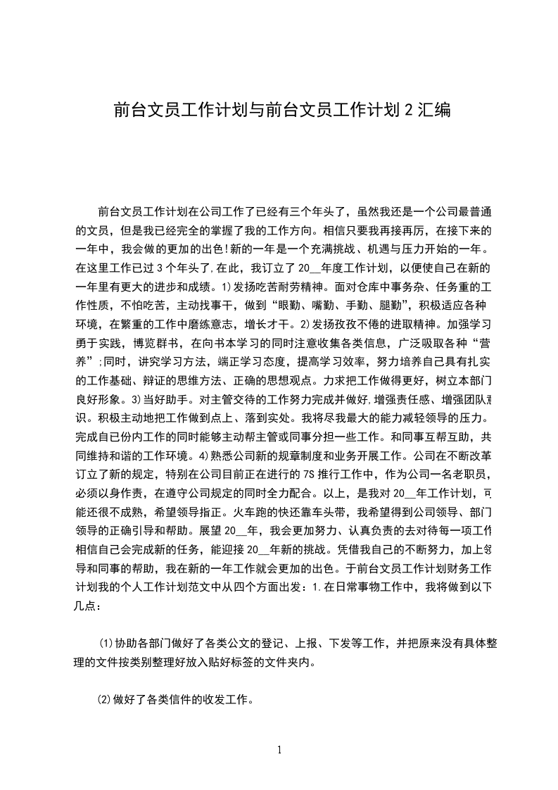 前台文员工作计划在公司工作了已经有三个年头了,虽然我还是一个公司最普通的文员,但是我已经完全的掌握了我的工作方向。相信只要我再接再厉,在接下来的一年中,我会做的更加的出色!新的一年是一个充满挑战、机遇与压力开始的一年。在这里工作已过3个年头了,在此,我订立了20__年度工作计划,以便使自己在新的一年里有更大的进步和成绩。1)发扬吃苦耐劳精神。面对仓库中事务杂、任务重的工作性质,不怕吃苦,主动找事干,做到“眼勤、嘴勤、手勤、腿勤”,积极适应各种环境,在繁重的工作中磨练意志,增长才干。2)发扬孜孜不倦的进取精神。加强学习,勇于实践,博览群书,在向书本学习的同时注意收集各类信息,广泛吸取各种“营养”;同时,讲究学习方法,端正学习态度,提高学习效率,努力培养自己具有扎实的工作基础、辩证的思维方法、正确的思想观点。力求把工作做得更好,树立本部门良好形象。3)当好助手。对主管交待的工作努力完成并做好,增强责任感、增强团队意识。积极主动地把工作做到点上、落到实处。我将尽我最大的能力减轻领导的压力。完成自已份内工作的同时能够主动帮主管或同事分担一些工作。和同事互帮互助,共同维持和谐的工作环境。4)熟悉公司新的规章制度和业务开展工作。公司在不断改革,订立了新的规定,特别在公司目前正在进行的7S推行工作中,作为公司一名老职员,必须以身作责,在遵守公司规定的同时全力配合。以上,是我对20__年工作计划,可能还很不成熟,希望领导指正。火车跑的快还靠车头带,我希望得到公司领导、部门领导的正确引导和帮助。展望20__年,我会更加努力、认真负责的去对待每一项工作。相信自己会完成新的任务,能迎接20__年新的挑战。凭借我自己的不断努力,加上领导和同事的帮助,我在新的一年工作就会更加的出色。于前台文员工作计划财务工作计划我的个人工作计划范文中从四个方面出发:1.在日常事物工作中,我将做到以下几点: