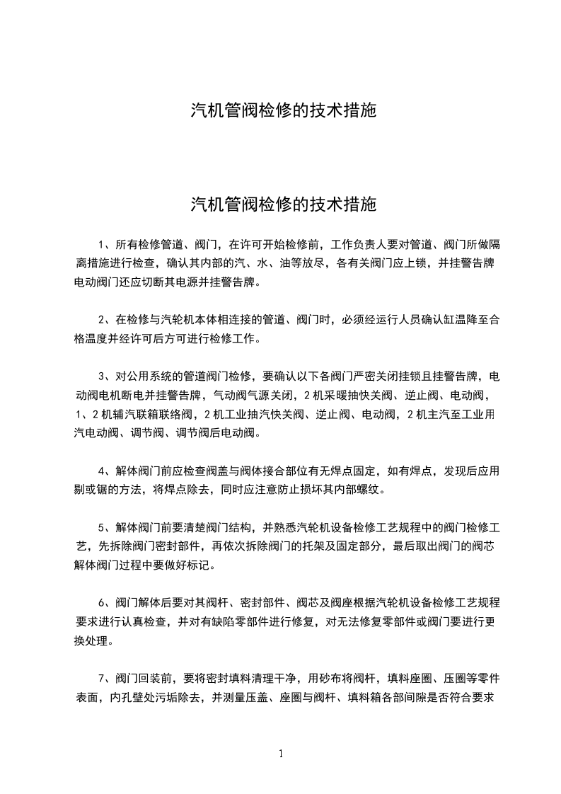 1.作业现场的基本条件。1.1作业现场的生产条件和安全设施等应符合有关标准、规范的要求,工作人员的劳动防护用品应合格、齐备。1.2经常有人工作的场所及施工车辆上应配备急救箱,存放急救用品,并应指定专人经常检查、补充或更换。1.3现场使用的安全工器具应合格并符合有关要求。1.4各类作业人员应被告知其作业现场和工作岗位存在的危险因素、防范措施及事故应急处理措施。2.作业人员的基本条件。2.1具有严格执行安全规章制度的正确态度。2.2经医师鉴定,无妨碍工作的病症(体格检查每两年至少一次)。2.3具备必要的相关知识和业务技能,且按工作性质,熟悉本规程的相关部分,并经考试合格。2.4具备必要的安全健康知识,学会紧急救护法。2.5特种作业人员应持证上岗。3.作业人员的安全职责3.1班段长安全职责:1)工作必要性;2)安全措施是否正确完备;3)所派工作负责人和工作班人员是否适当和充足。3.2工作负责人安全职责:1)正确安全地组织工作;2)安全措施是否正确完备和安全措施是否符合现场实际条件,必要时予以补充;3)工作前对工作班成员进行危险点告知,交代安全措施和技术措施,并确认每一个工作班成员都以知晓;4)严格执行工作票所列安全措施;5)督促、监护工作班成员遵守本规程、正确使用劳动防护用品和执行现场安全措施;6)工作班成员精神状态是否良好,变动是否合适。3.3专责监护人1)明确被监护人员和监护范围;2)工作前对被监护人员交代安全措施,告知危险点和安全注意事项;3)监督被监护人员遵守本安全措施,及时纠正不安全行为。3.4工作班成员:1)熟悉工作内容、工作流程,掌握安全措施,明确工作中的危险点,并履行确认手续;2)严格遵守安全规章制度、技术规程和劳动纪律,对自己在工作中的行为负责,互相关心工作安全,并监督本规程的执行和现场安全措施的实施;3)正确使用安全工器具和劳动防护用品。4.保证安全的技术措施4.1隔离4.1.2热网各蒸汽管道、循环水管道以及公共排污、疏水等热力系统检修,应关严所有应于的截门、闸板、挡板。如于不严,应关严前一道截门或采取其他安全措施。4.1.3在下水沟(含除灰沟)、疏水沟或敷设有汽、水等管道、阀门的地下沟道和井下进行检修工作,应于向工作地点流入蒸汽或水等介质的有关截门或闸板。工作中如需冲洗沟道,应先将工作人员从沟道内撤离并清点人数无误后,再开启有关阀门或闸板。4.1.4在压力管道上进行长时间的检修工作时,检修管段应用带尾巴的堵板与运行中的管段隔断,或将它们之间的两个串联,严密不漏的阀门关严,两个串联阀门之间的疏水门或放水门应予打开。于的阀门和打开的疏水门或放水门应上锁,并挂标示牌。4.2泄压放的方向。