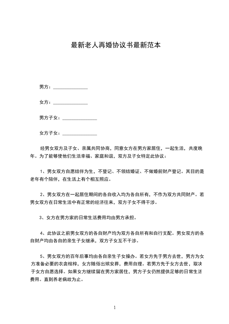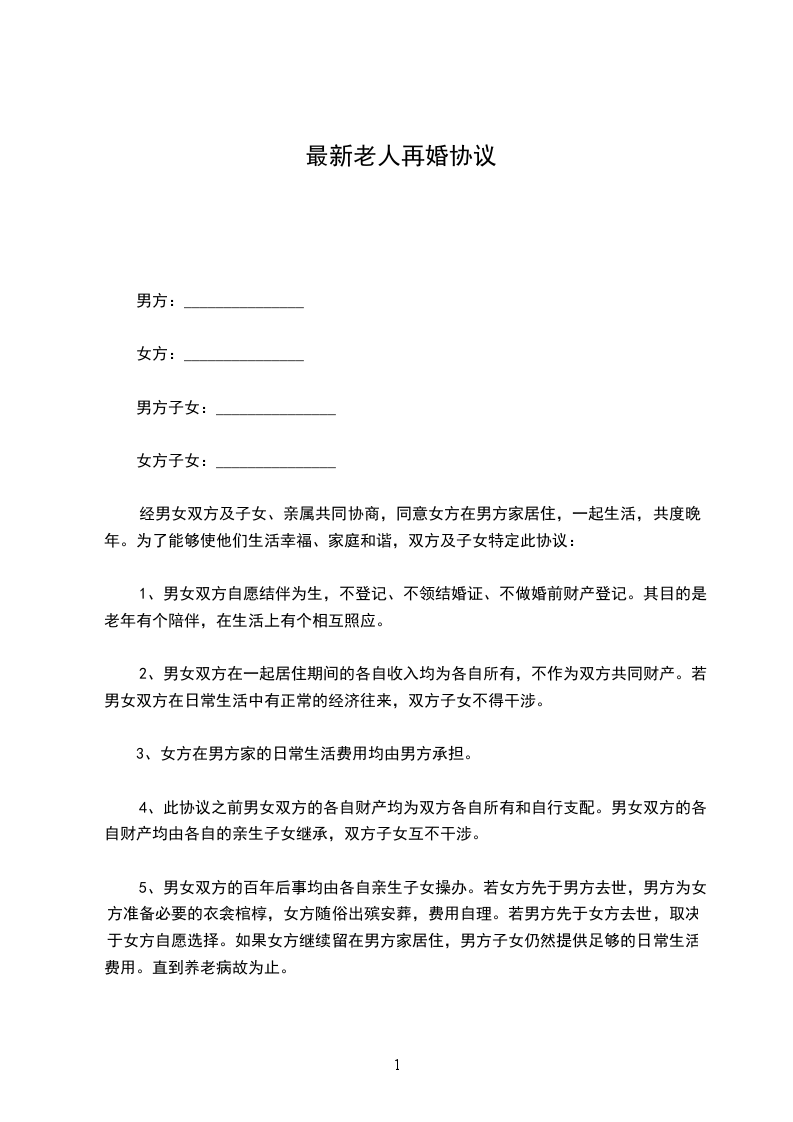 男、女双方均系独身,现年龄较大。为了生活上能有所照料,情感上有所依托,双方自愿结婚。同时为了能够生活美满,家庭和谐,双方及子女特定此协议。
