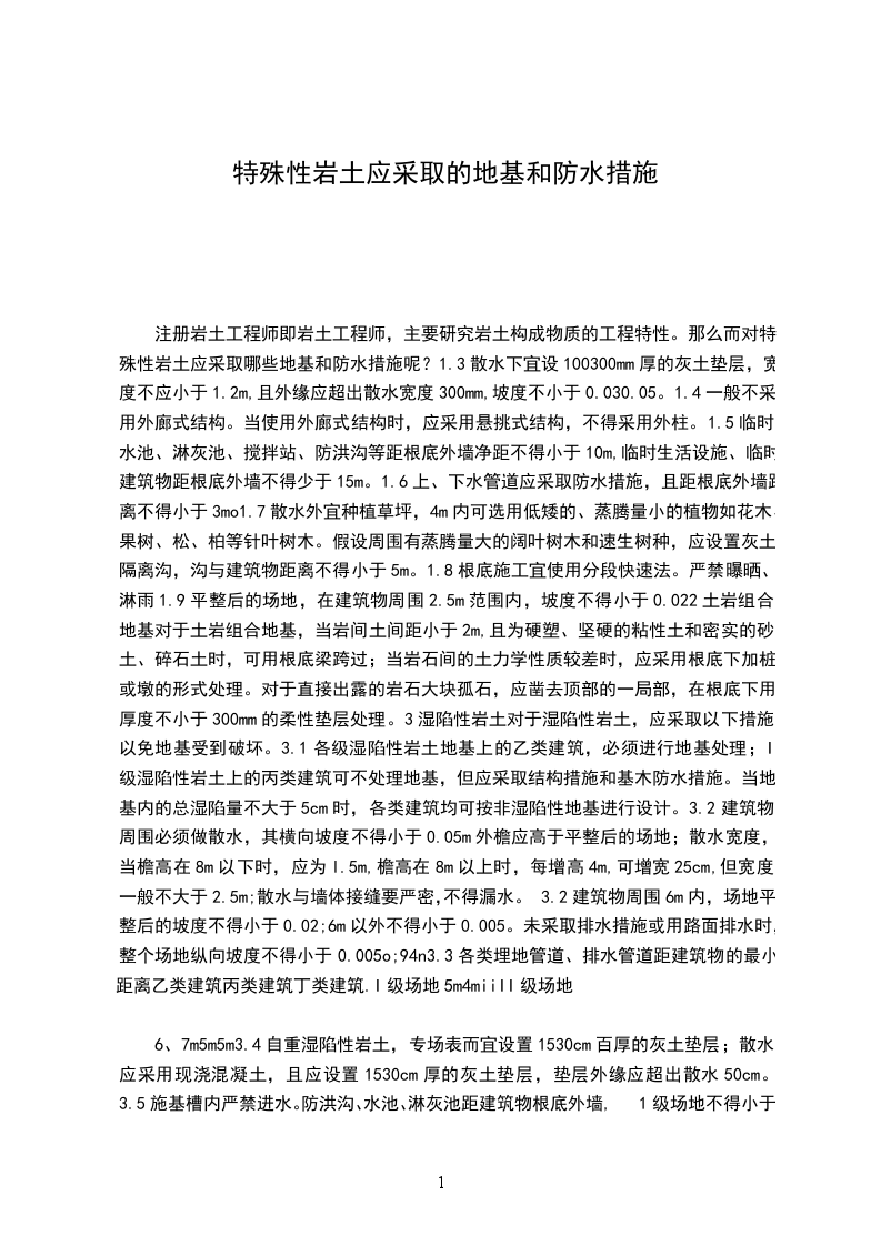 注册岩土工程师即岩土工程师,主要研究岩土构成物质的工程特性。那么而对特殊性岩土应采取哪些地基和防水措施呢?1.3散水下宜设100300mm厚的灰土垫层,宽度不应小于1.2m,且外缘应超出散水宽度300mm,坡度不小于0.030.05。1.4一般不采用外廊式结构。当使用外廊式结构时,应采用悬挑式结构,不得采用外柱。1.5临时水池、淋灰池、搅拌站、防洪沟等距根底外墙净距不得小于10m,临时生活设施、临时建筑物距根底外墙不得少于15m。1.6上、下水管道应采取防水措施,且距根底外墙距离不得小于3mo1.7散水外宜种植草坪,4m内可选用低矮的、蒸腾量小的植物如花木、果树、松、柏等针叶树木。假设周围有蒸腾量大的阔叶树木和速生树种,应设置灰土隔离沟,沟与建筑物距离不得小于5m。1.8根底施工宜使用分段快速法。严禁曝晒、淋雨1.9平整后的场地,在建筑物周围2.5m范围内,坡度不得小于0.022土岩组合地基对于土岩组合地基,当岩间土间距小于2m,且为硬塑、坚硬的粘性土和密实的砂土、碎石土时,可用根底梁跨过;当岩石间的土力学性质较差时,应采用根底下加桩或墩的形式处理。对于直接出露的岩石大块孤石,应凿去顶部的一局部,在根底下用厚度不小于300mm的柔性垫层处理。3湿陷性岩土对于湿陷性岩土,应采取以下措施以免地基受到破坏。3.1各级湿陷性岩土地基上的乙类建筑,必须进行地基处理;I级湿陷性岩土上的丙类建筑可不处理地基,但应采取结构措施和基木防水措施。当地基内的总湿陷量不大于5cm时,各类建筑均可按非湿陷性地基进行设计。3.2建筑物周围必须做散水,其横向坡度不得小于0.05m外檐应高于平整后的场地;散水宽度,当檐高在8m以下时,应为l.5m,檐高在8m以上时,每增高4m,可增宽25cm,但宽度一般不大于2.5m;散水与墙体接缝要严密,不得漏水。3.2建筑物周围6m内,场地平整后的坡度不得小于0.02;6m以外不得小于0.005。未采取排水措施或用路面排水时,整个场地纵向坡度不得小于0.005o;94n3.3各类埋地管道、排水管道距建筑物的最小距离乙类建筑丙类建筑丁类建筑.I级场地5m4miiII级场地