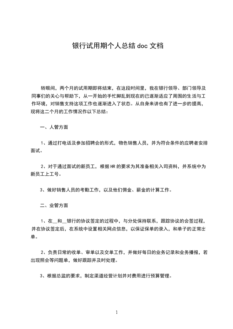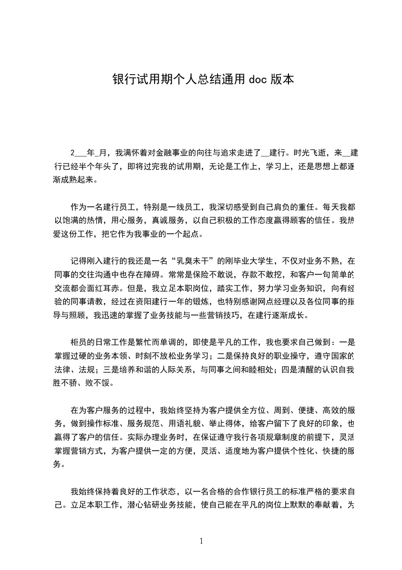 个人工作总结(文章一):银行员工试用期工作总结银行员工试用期工作总结白驹过隙,两个多月的试用期即将结束!从6月18号工作至今,每天都过得很充实,我从刚进来的陌生到现在的熟悉,这个过程,__信社的领导以及各位同事给了我很大的支持与鼓舞,他们的信任与教导使我不断进步。对于一个非银行业相关专业毕业的求职者来说,能够有这样一个机会进入农信工作,对我来说既是机遇又是挑战。诚然,对于一个对银行业务不甚了解的门外汉来说,在银行这样的单位里,在完全陌生的领域中,我必须从头学起。在我刚进农信的几天里,认识这里的同事,以及熟悉这里的工作环境对我来说是首先需要解决的问题。在很短的时间里,我就已经认识了大家,渐渐开始熟悉了这里的一切为了熟悉农信的各种业务和基本知识,我看了不少如柜台、信贷、稽核、会计准则、财务等方面的业务书籍,在接触到一些不太熟悉的术语以及科目时,我就会在网上查找相关的解释,如果实在不明白,我就向同事们请教,大家也都不厌其烦地给我讲解,并且想方设法让我去接触更多我尚不熟悉的知识。在上柜台实际操作的这段日子里,由开始时的紧张与生涩到现在的淡定与熟练,虽有自己的努力,更多的是与各位同事的鼓舞与支持离不开的,在我做的好的时候,他们给与了我肯定,在我出错的时候,没有了责骂,而是理解与教导,他们用过来人的身份传授给我切身经验,这样的好同事,怎能不让我加倍努力呢有了业务知识还不够,还得过硬的业务素质和道德素质,通过学习职业道德规范读本以及信社定期开展的案件防控专项整治工作以及会议精神,我深知作为农信员工,一定得经得起考验,经得起诱惑,做到莲花般的__,微笑服务,举止文明,切实做到“手握手的承诺,心贴心的服务”。在同事们需要的情况下,我也会尽自己所能去给大家提供便利,每天我都准时上下班,回到营业厅时做好各种开展业务前的准备工作,如泡茶、开电脑或者是下班前的清洁尽管这都算不上什么大事,只是我的举手之劳,不过我觉得正是这样一个良好和谐的办公室气氛,使我在一个祥和的环境中可以把工作做得最好。对于我这样一个从大学走出来时间还不算长的新人来讲,在工作中还是会遇到不少这样那样的问题,包括工作方式以及与人交际方面的,在这段时间中,我已经在这些方面有了长足的进步,而且自己的心理状态已经完全从学生状态转变成一个社会人了。我想自己之所以能够比较快地完成这种转换,跟我们筠洲信社有着的良好的工作环境氛围是很分不开的,在这样一种和谐气氛中,我还有什么理由不在这里取得进步和提高吗总结这两个多月来的日子,我自我认为取得了很大进步,学到了很多,虽然也犯了不少错。在此真诚感谢信社领导的关怀与个同事的教导,试用期的结束,并不是真的结束,而是新的开始,是对我更严峻的考验,我将加倍努力,用青春的汗水去灌溉农信社这颗茁壮成长的大树!(文章二):银行新员工试用期个人总结银行新员工试用期个人总结不知不觉间,自己在顺义XX营业部的实习工作已经接近尾声,这五个月来的实践工作,每一天我都有新的收获,每一天都有提高,每一天都能积累到宝贵的经验。此时静心回顾这五个月以来的工作与生活,油然而生了许许多多的感触和心得,而这些宝贵的财富也将伴随着自己走过未来的每一个工作阶段,在未来的每一个工作细节中帮助自己、提醒自己、升华自己的能力。从刚刚进入培训当中的应届毕业生,到现在的一个实习柜员,是一个质和量的蜕变。面试过后,我们就进入了严格的入职培训,培训中我了解了__行的历史发展和企业文化,学习了职业基本技能,掌握了业务流程,深刻的认识到柜员的工作复杂且责任重大。银行业归根结底属于服务性行业,而对于银行来说,柜员是银行面向外界的第一窗口,我们的一言一行、不仅表现了我们自己的业务能力,同时也展现了顺义XX的整体风采,对__行银行的发展有着至关重要的作用。因此,柜员做好服务工作就显得格外重要。在工作中,我时刻将规范服务的重要性放在心上,微笑待人,礼貌用语,想客户之所想,忧客户之所忧,以客户为中心,力争做到让客户高兴而来,满意而归。起初我站在柜员岗边努力观察他们的操作流程,认真记忆每笔业务的交易码,并且注意各位同事与客户的交流过程,从中能够学到很多业务中需要注意的细节,明确了学习重点,提高了学习效率。我把每次学到的重点记在纸上,空闲的时候就拿出来翻看,看得次数多也就记在脑子里了,有时看不懂了就问,同事也非常友好地给我讲解,给我学习过程创造了非常有利的条件。在各位同事和领导的训练指导下,在自己的刻苦努力下,我的技能水平渐渐提高,柜面办理业务的效率也随之提高了,所以对各位同事和领导我心里充满感激。在业余时间,我也不忘鞭策自己,认真练习点钞、计算器、中文录入、个金业务每一项技能。虽然在实际操作之前,我已经做了过很多积累工作,但刚开始上柜操作时还是感觉手忙脚乱,对于客户的提问也显得不知所措。在师傅和同事们的真诚帮助和耐心指导下,思想汇报专题我虚心地学习请教,并把问过的业务认真地做笔记,很快我便可以迅速有效的完成存取款、挂失、外汇买卖、存款证明的开立等各项柜面基本业务。工作中我深刻的认识到一笔业务的顺利完成,不仅是一