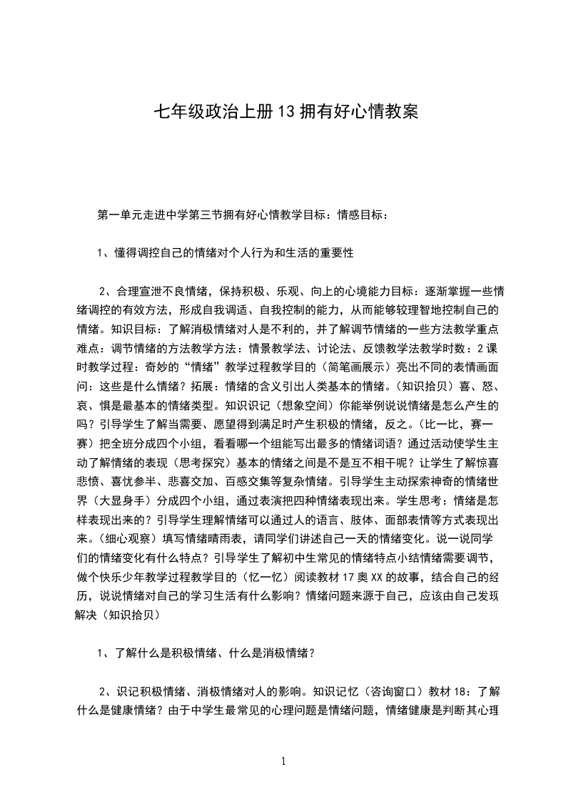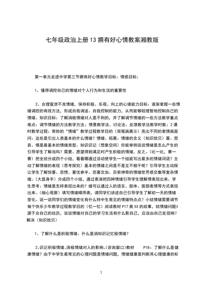 第一单元走进中学第三节拥有好心情教学目标:情感目标: