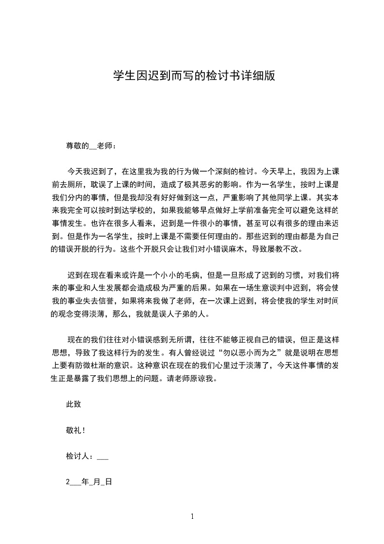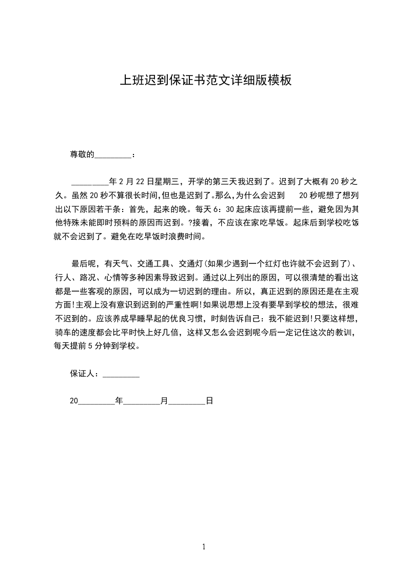 _________年2月22日星期三,开学的第三天我迟到了。迟到了大概有20秒之久。虽然20秒不算很长时间,但也是迟到了。那么,为什么会迟到20秒呢想了想列出以下原因若干条:首先,起来的晚。每天6:30起床应该再提前一些,避免因为其他特殊未能即时预料的原因而迟到。?接着,不应该在家吃早饭。起床后到学校吃饭就不会迟到了。避免在吃早饭时浪费时间。