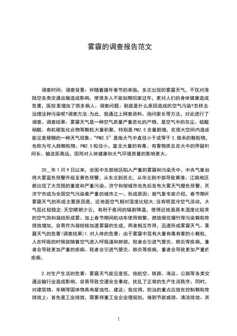调查时间:调查背景:伴随着猪年春节的来临,多次出现的雾霾天气,不仅对海陆空各类交通运输造成影响,使很多人不能如期回家过年,更对人们的身体健康造成危害,医院里增加了很多病人。调查问题:到底是什么原因造成的空气污染?怎样去治理这种污染呢?调查方法:为此,我通过上网查资料、询问家长等方法,对此进行了调查。调查结果:雾霾天气是一种空气质量严重恶化的产物,是空气中的灰尘、硫酸、硝酸、有机碳氢化合物等颗粒大量积聚,特别是PM2.5含量剧增,在很大空间内造成能见度模糊的一种天气现象。“PM2.5”是指大气中直径小于或等于2.微米的颗粒物,也称为可入肺颗粒物。PM2.5粒径小,富含大量的有毒、有害物质且在大中的停留时间长、输送距离远,因而对人体健康和大气环境质量的影响更大。