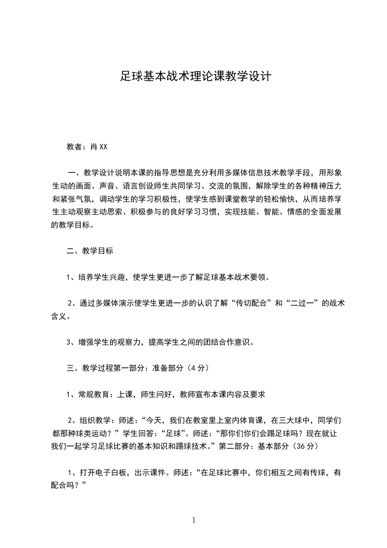 四、教师互动教师提问:通过学习,你们了解了传切配合和二过一这两种足球基本战术了吗?学生:阐述两种基本战术,教师配合学生利用信息技术画出战术配合线路图。