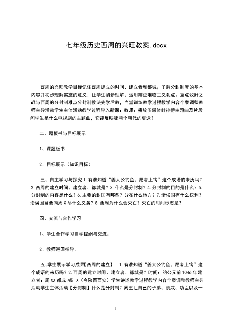 7、什么是分封制?它有何作用?【展示交流】(各小组派代表展示,其他各组认真听取,可以质疑,也可进行补充。)教师对各组回答的问题进行点拨和分析。引导学生探究发现新疑问。对小组进行恰当评价。【拓展延伸】(走进历史,感悟历史)