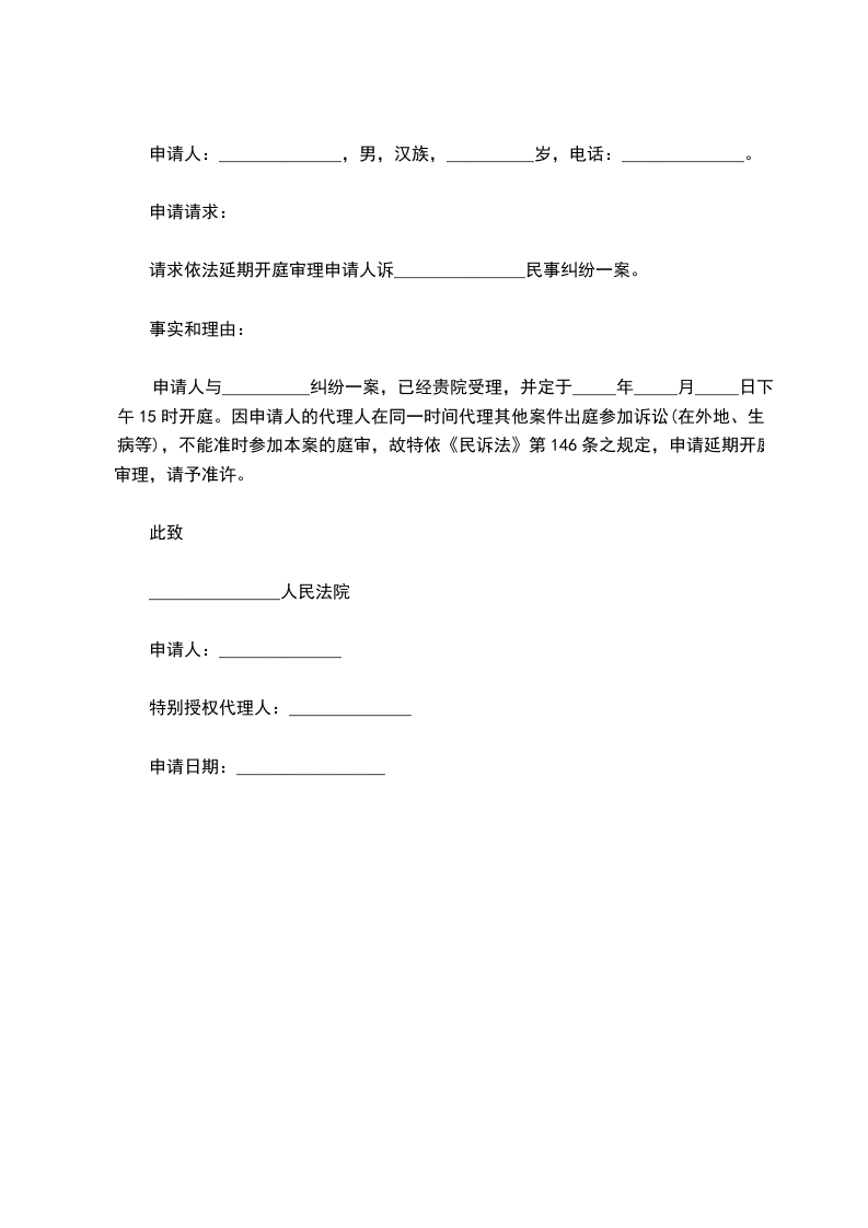 关于__________区人民法院(_________)民初字第_________号“申请人_________诉_________债务纠纷”一案,现因申请人无法按期出庭,请求人民法院延期审理。