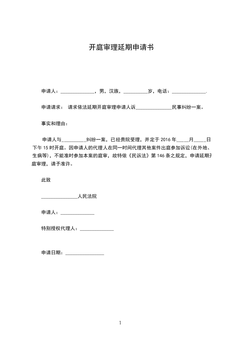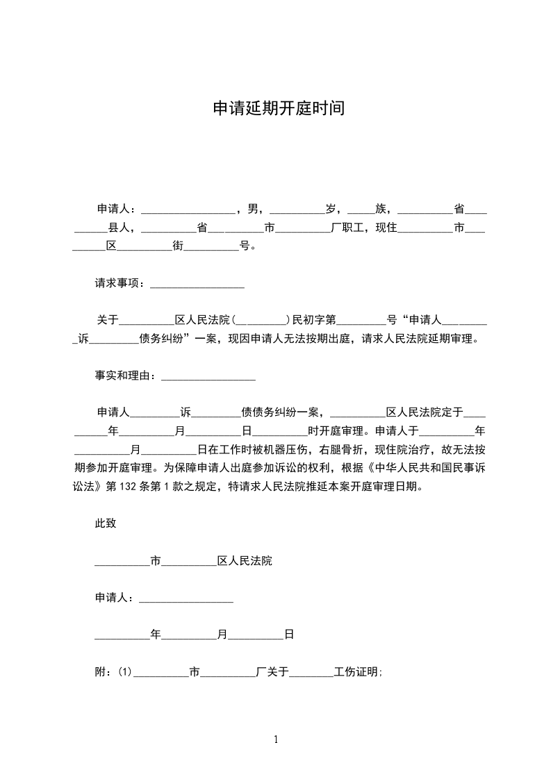 申请人_________诉_________债债务纠纷一案,__________区人民法院定于__________年__________月__________日__________时开庭审理。申请人于__________年__________月__________日在工作时被机器压伤,右腿骨折,现住院治疗,故无法按期参加开庭审理。为保障申请人出庭参加诉讼的权利,根据《中华人民共和国民事诉讼法》第132条第1款之规定,特请求人民法院推延本案开庭审理日期。