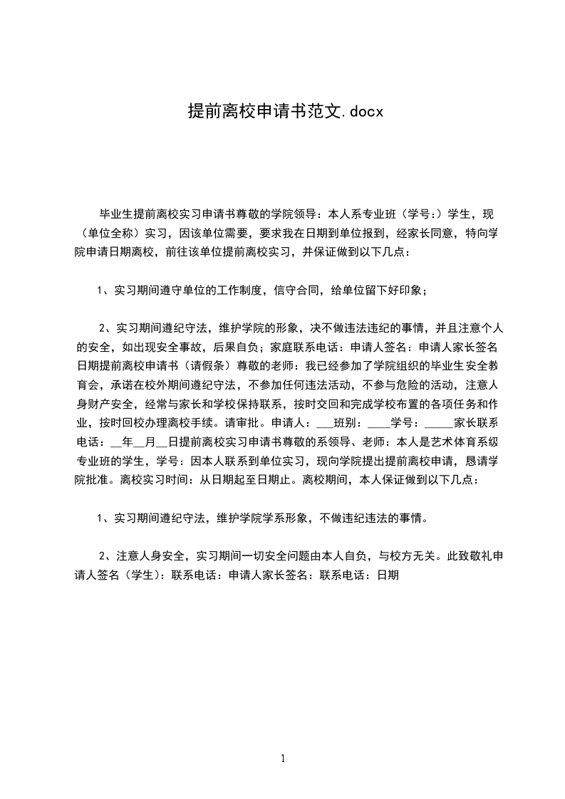 本人系__专业班(学号:__)学生__,由需要(提前报到/回家),经过家长同意,特向学院申请20__年__月__日离校前往__,目的地联系人:__,联系方式:__。