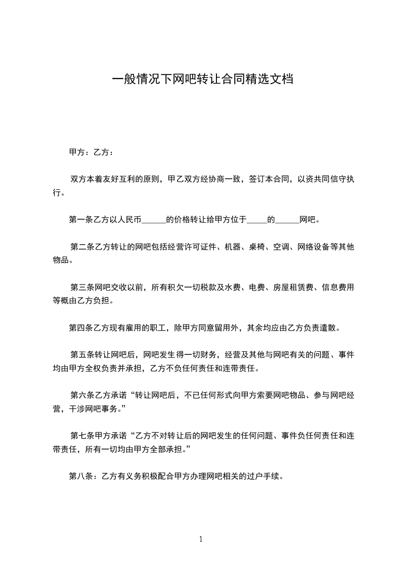 第一条乙方以人民币______的价格转让给甲方位于_____的______网吧。
