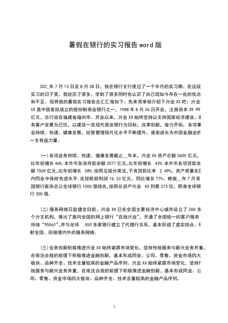 20_年据学校暑期社会实践要求,本人于_年7月15日到8月25日在中国XX进行了为期5周的实习。实习期间,在单位指导老师的帮助下,我熟悉了金融机构的主要经济业务活动,系统地学习并较好掌握了银行会计实务工作,理论水平和实际工作能力均得到了锻炼和提高。现将毕业实习的具体情况及体会作一系统的总结。