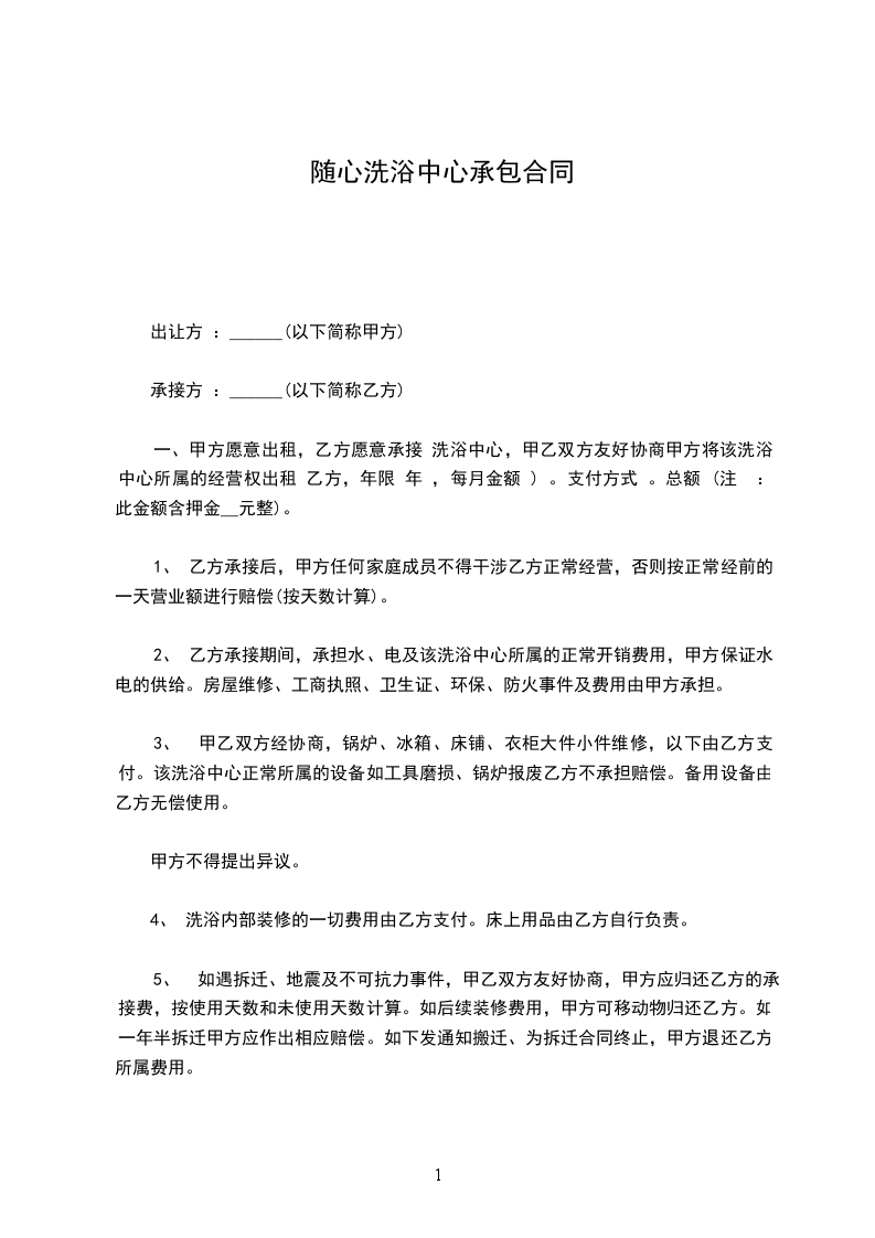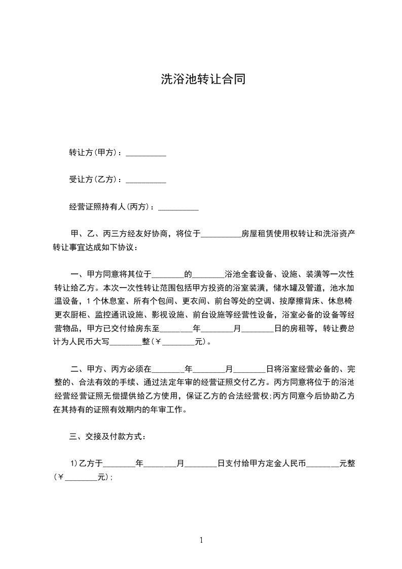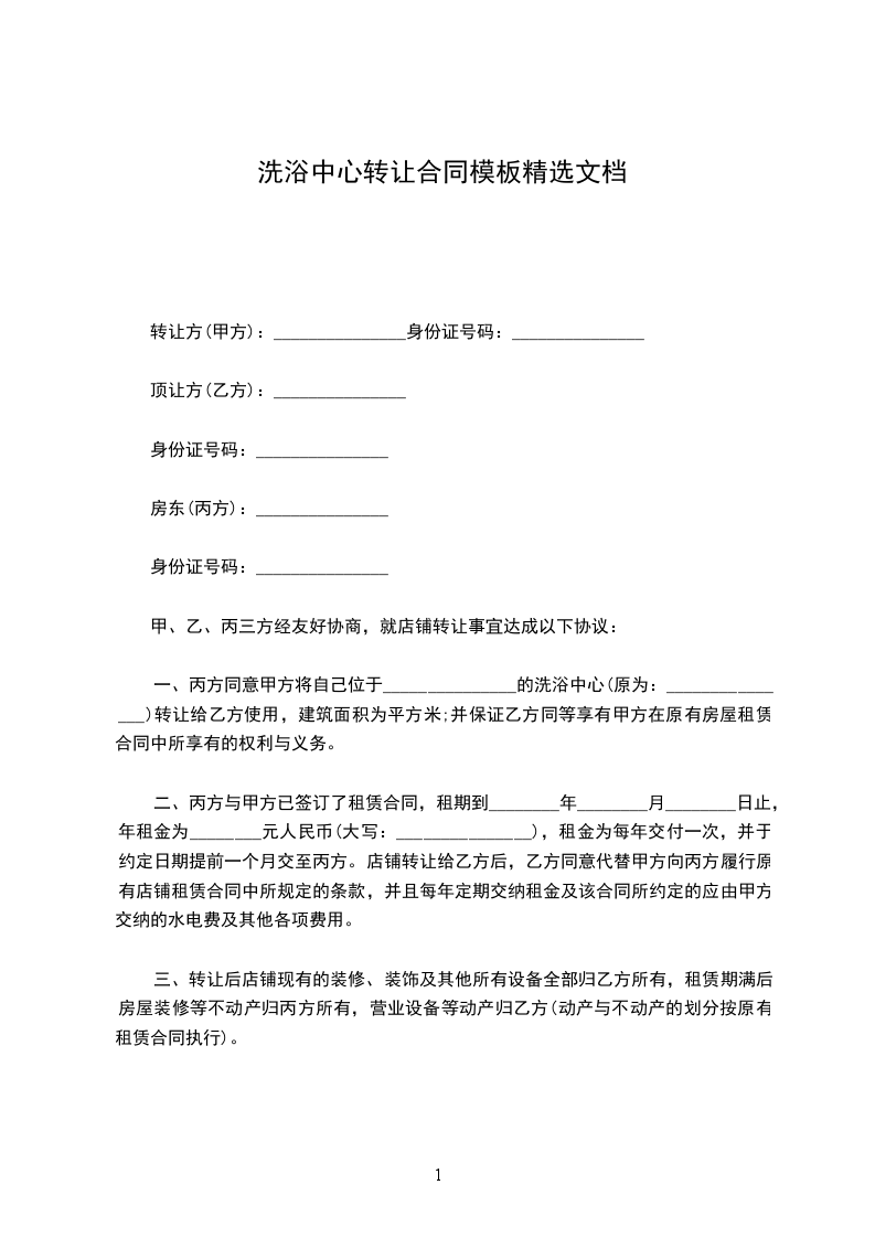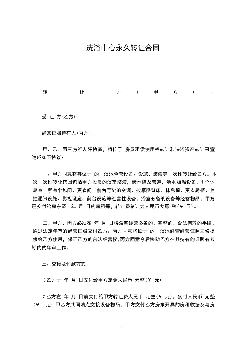 一、丙方同意甲方将自己位于_______________的洗浴中心(原为:_______________)转让给乙方使用,建筑面积为平方米;并保证乙方同等享有甲方在原有房屋租赁合同中所享有的权利与义务。