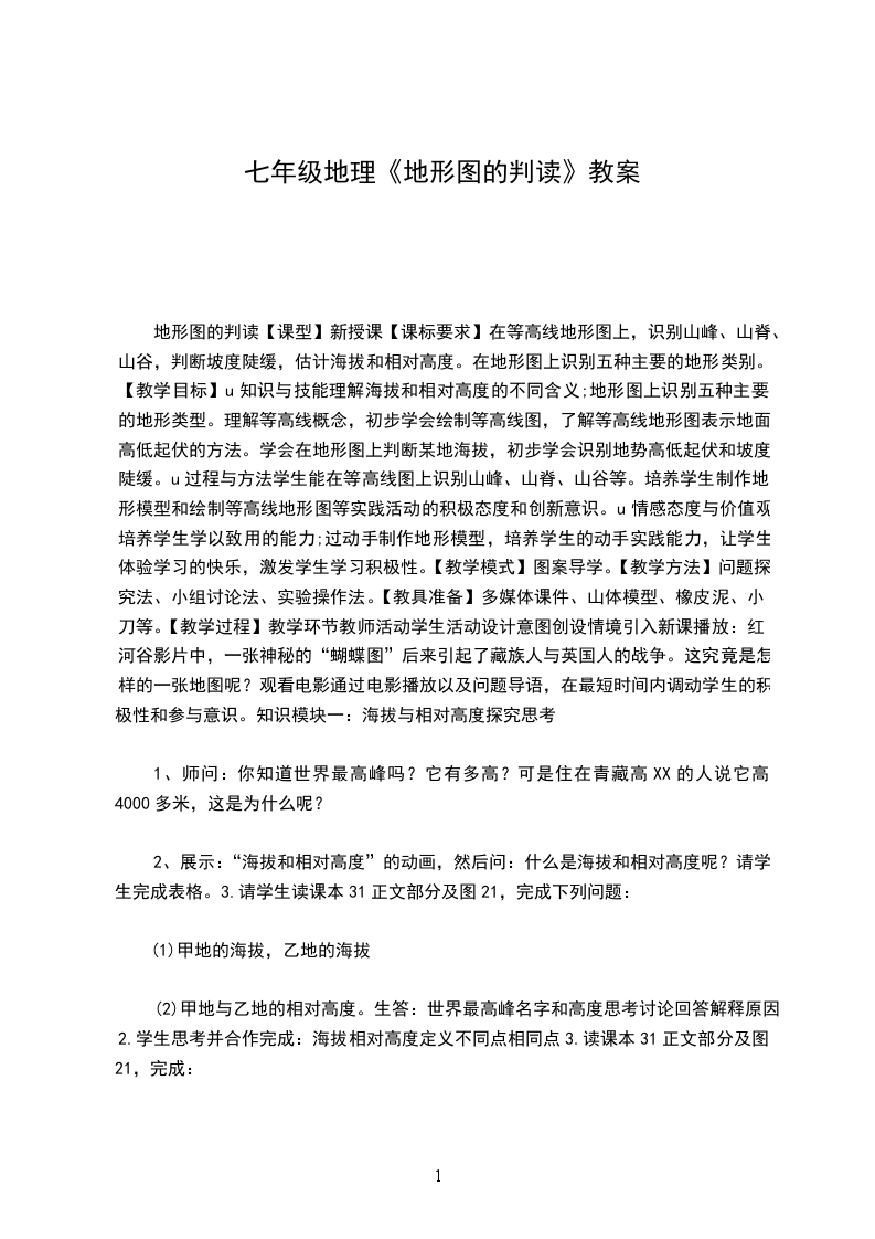 (二)第9课时教学目的知识和技能:在地形图上识别高原、山地、盆地、丘陵、平原等五种地形。能在东高线地形图上估算图上某个地点的高程。过程和方法:培养学生阅读地图能力。情感、态度和价值观:培养学生的空间想象力和分析思考问题的能力。学情分析学生对这部分知识有所了解,但是在处理中需要教师点拨重点等高线的判读难点等高线教学方法讲述与问答相结合的方法教学手段地图册学法指导对学生探究能力的培养教学过程共案部分个案部分组织教学:提问导入
