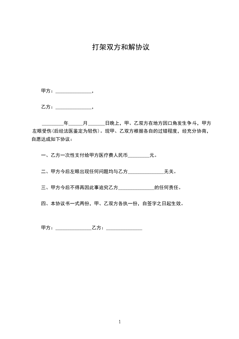 _________年______月_______日晚上,甲、乙双方在地方因口角发生争斗,甲方左眼受伤(后经法医鉴定为轻伤)。现甲、乙双方根据各自的过错程度,经充分协商,自愿达成如下协议: