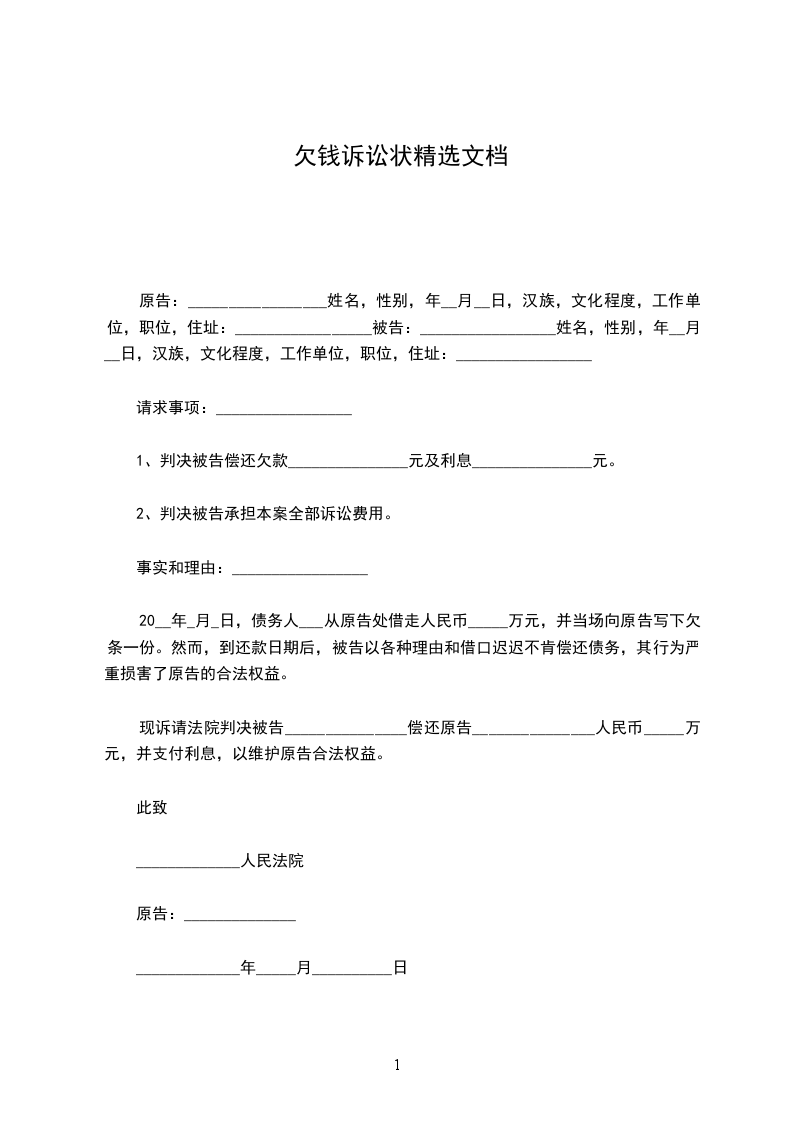 1、判决被告偿还欠款_______________元及利息_______________元。