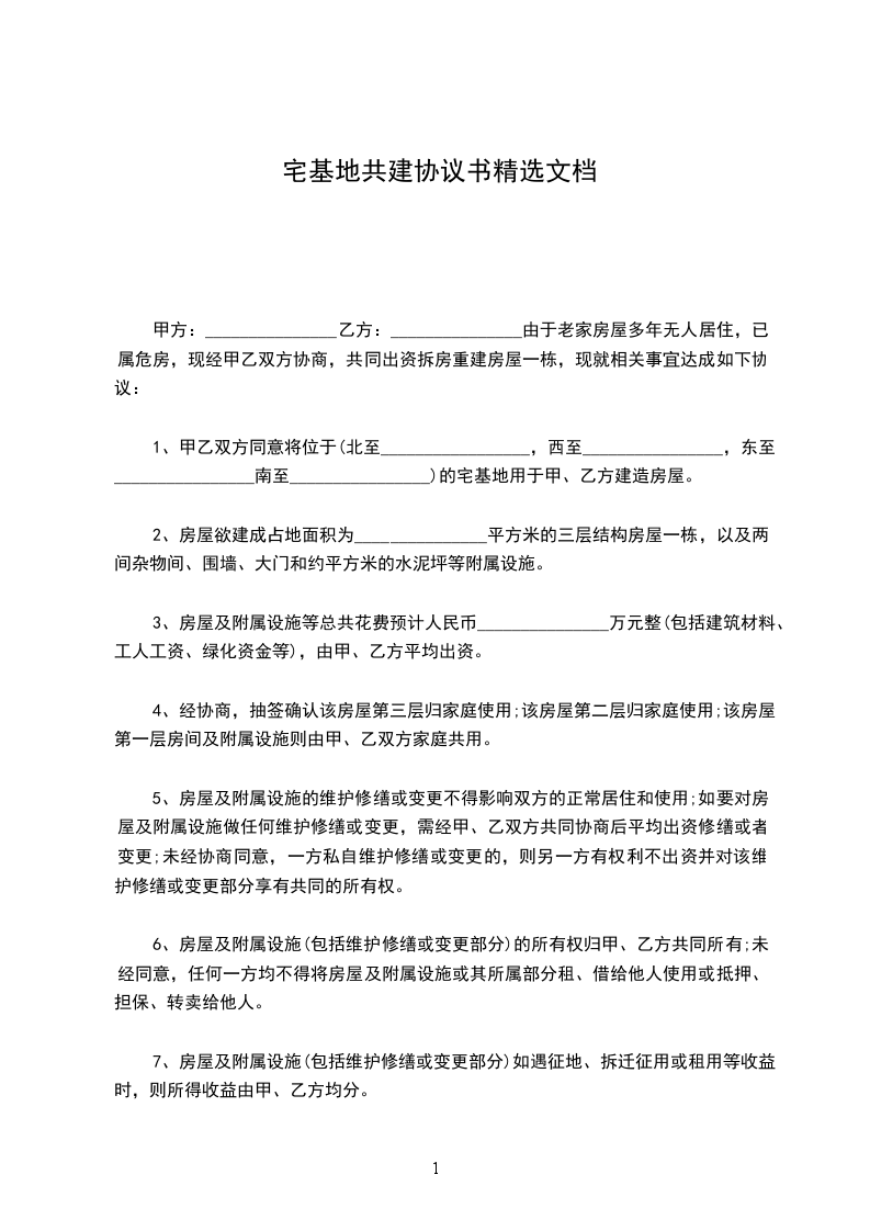 甲方:_______________乙方:_______________由于老家房屋多年无人居住,已属危房,现经甲乙双方协商,共同出资拆房重建房屋一栋,现就相关事宜达成如下协议: