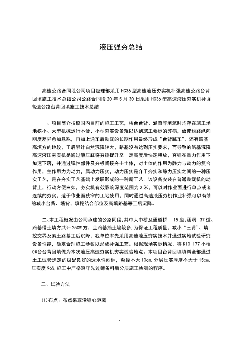二、工程概况__市北票县至公路,起于,终点,路线全长13公路,路基顶面宽度为16米.应工期紧,路基填筑完成后立即施工路面,没有经历一个冻融期,为消除工后沉降对公路质量的影响,减小地基不均匀沉降,采取强夯加固举措对填筑完成的路基顶面进行加固处理.强夯处理后地基承载力不小___