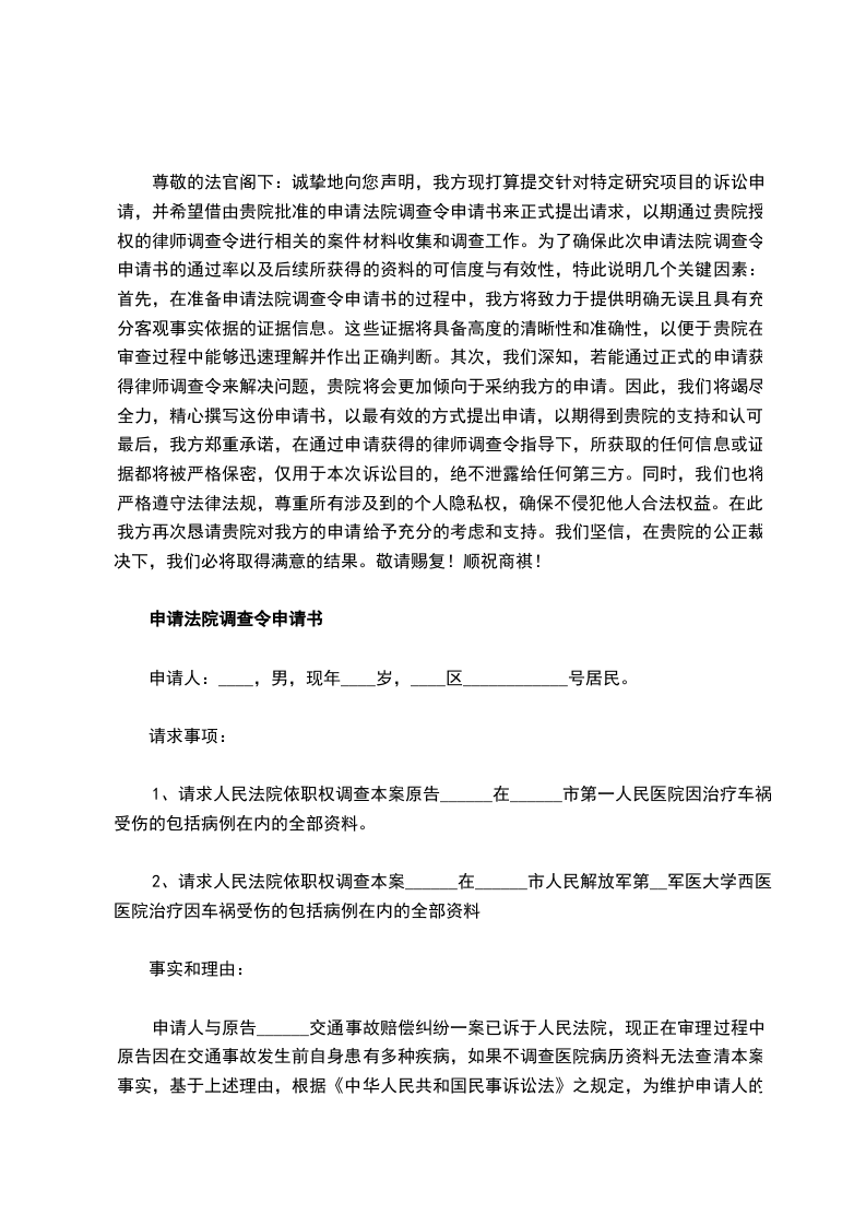 2、请求人民法院依职权调查本案_______在_______市人民解放军第_____军医大学西医医院治疗因车祸受伤的包括病例在内的全部资料