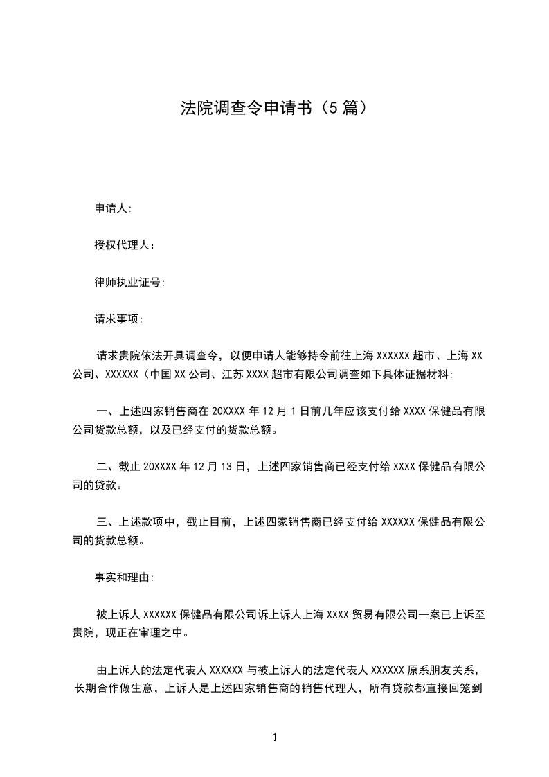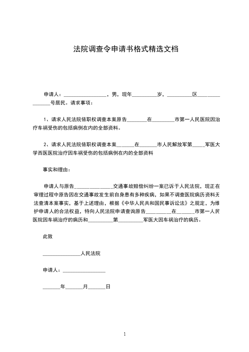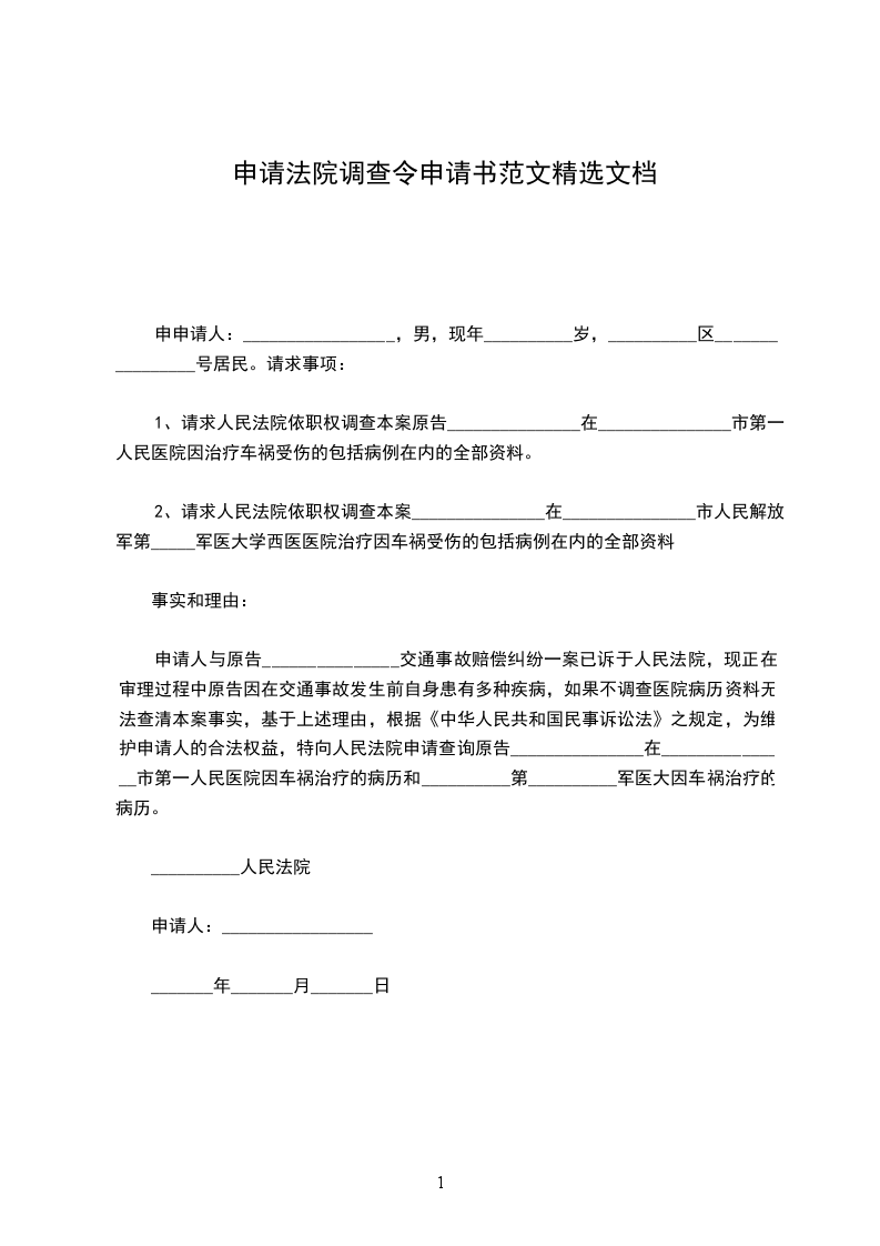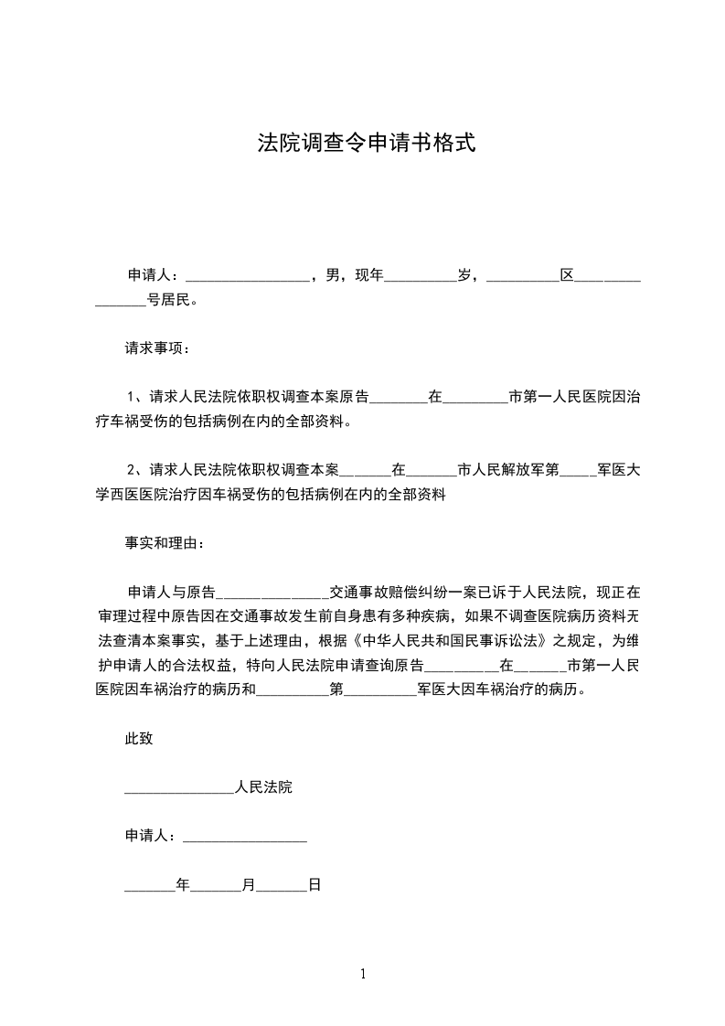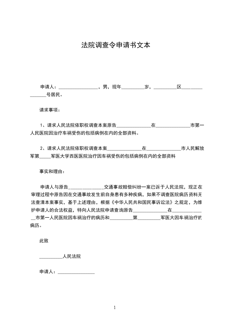 1、请求人民法院依职权调查本案原告________在_________市第一人民医院因治疗车祸受伤的包括病例在内的全部资料。