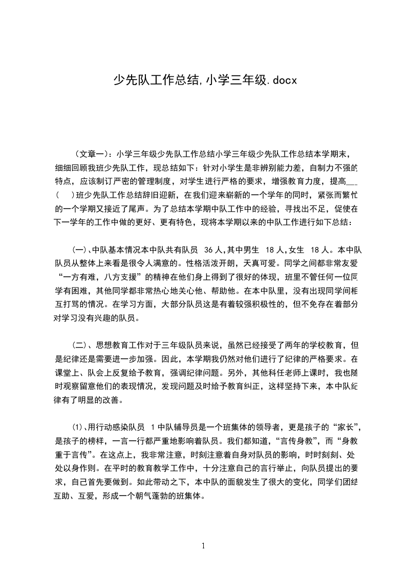 (文章一):小学三年级少先队工作总结小学三年级少先队工作总结本学期末,细细回顾我班少先队工作,现总结如下:针对小学生是非辨别能力差,自制力不强的特点,应该制订严密的管理制度,对学生进行严格的要求,增强教育力度,提高___( )班少先队工作总结辞旧迎新,在我们迎来崭新的一个学年的同时,紧张而繁忙的一个学期又接近了尾声。为了总结本学期中队工作中的经验,寻找出不足,促使在下一学年的工作中做的更好、更有特色,现将本学期以来的中队工作进行如下总结: