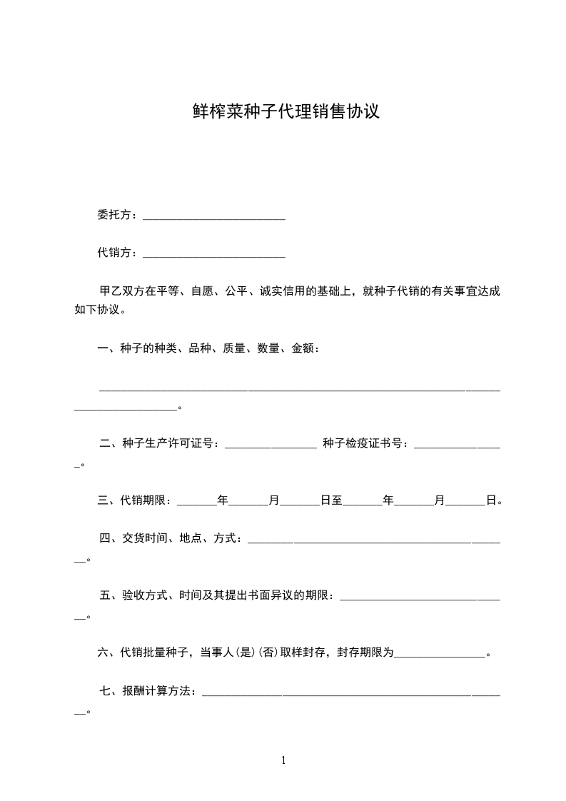 甲乙双方在平等、自愿、公平、诚实信用的基础上,就种子代销的有关事宜达成如下协议。