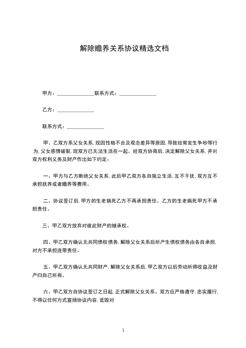 甲、乙双方系父女关系,现因性格不合及观念差异等原因,导致经常发生争吵等行为,父女感情破裂,现双方已无法生活在一起。经双方协商后,决定解除父女关系,并对双方权利义务及财产作出如下约定: