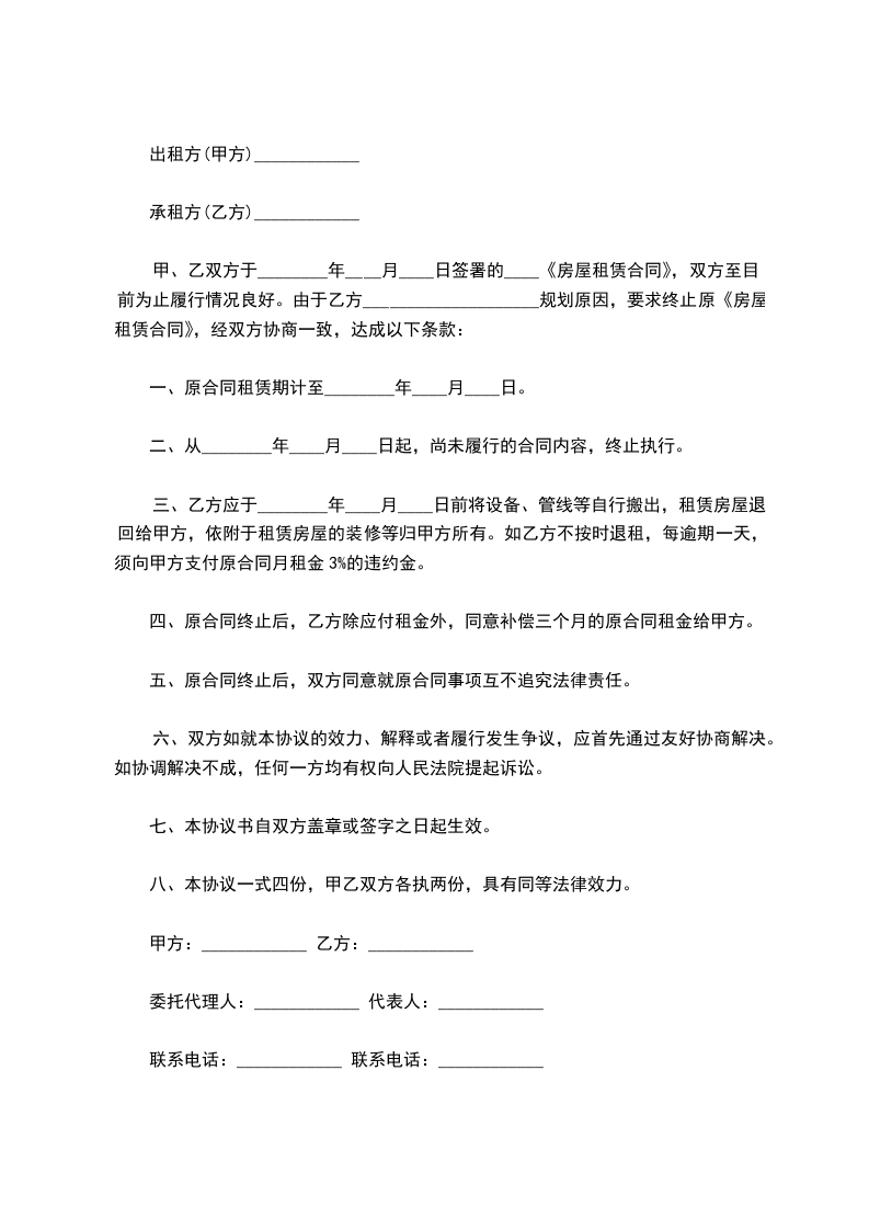 四、原合同终止后,乙方除应付租金外,同意补偿三个月的原合同租金给甲方。