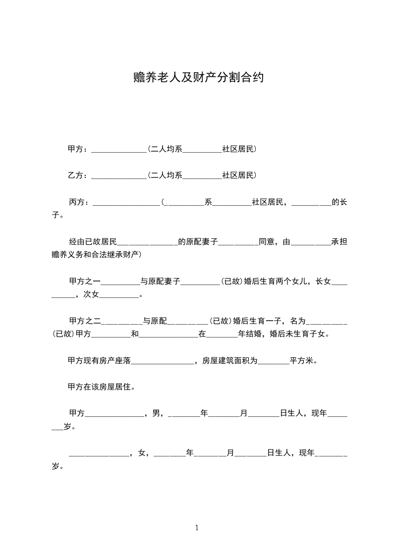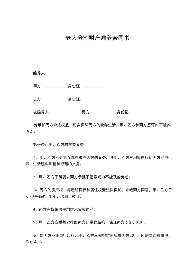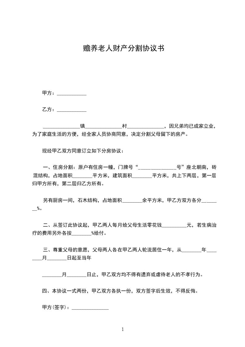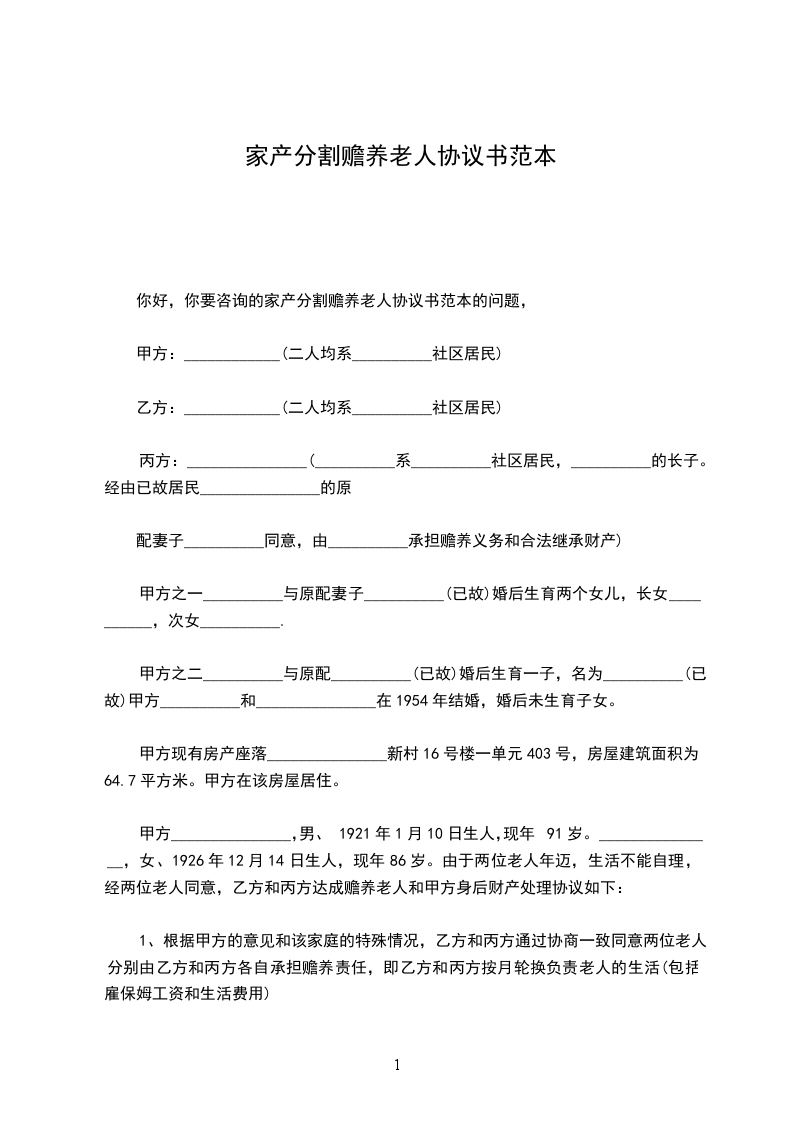 你好,你要咨询的家产分割赡养老人协议书范本的问题,
