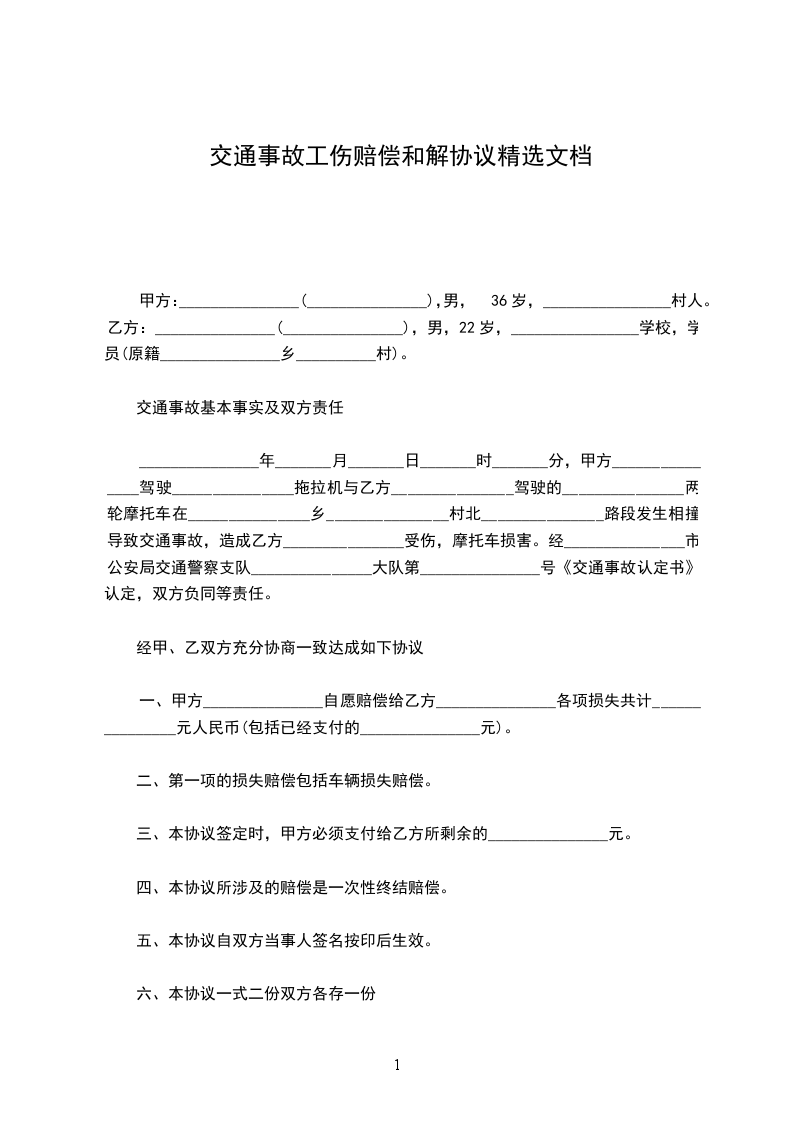 _______________年_______月_______日_______时_______分,甲方_______________驾驶_______________拖拉机与乙方_______________驾驶的_______________两轮摩托车在_______________乡_______________村北_______________路段发生相撞导致交通事故,造成乙方_______________受伤,摩托车损害。经_______________市公安局交通警察支队_______________大队第_______________号《交通事故认定书》认定,双方负同等责任。