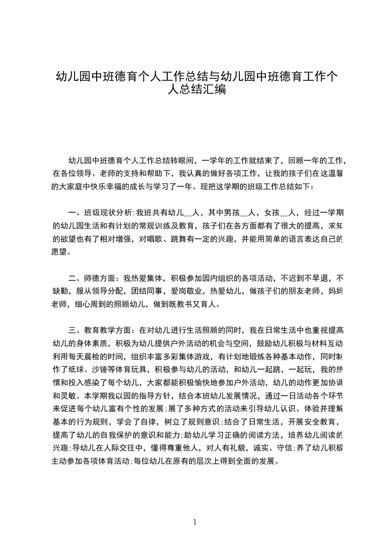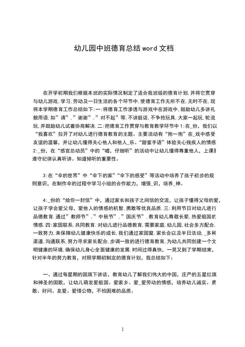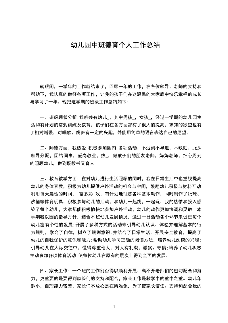 有关幼儿园中班德育工作总结本学年我们依据学园德育工作的指导方向,结合本班实际情况,认真制定了德育工作计划并通过实施加强幼儿的品德教育,为幼儿形成健全人格奠定良好基础。经过一学年的学习实践,我班幼儿的道德品质和行为习惯有了一定的提高,形成一个具有良好常规、团结向上的班集体。回顾本学年我班德育工作开展的情况作如下总结: